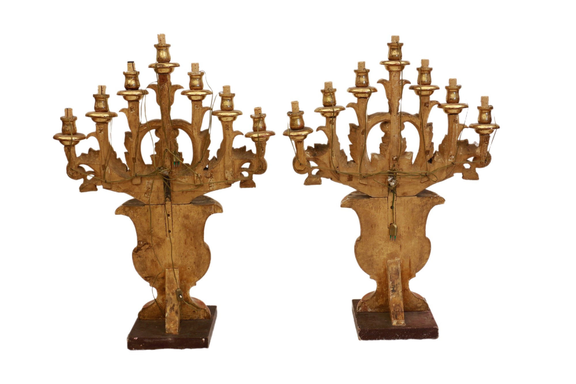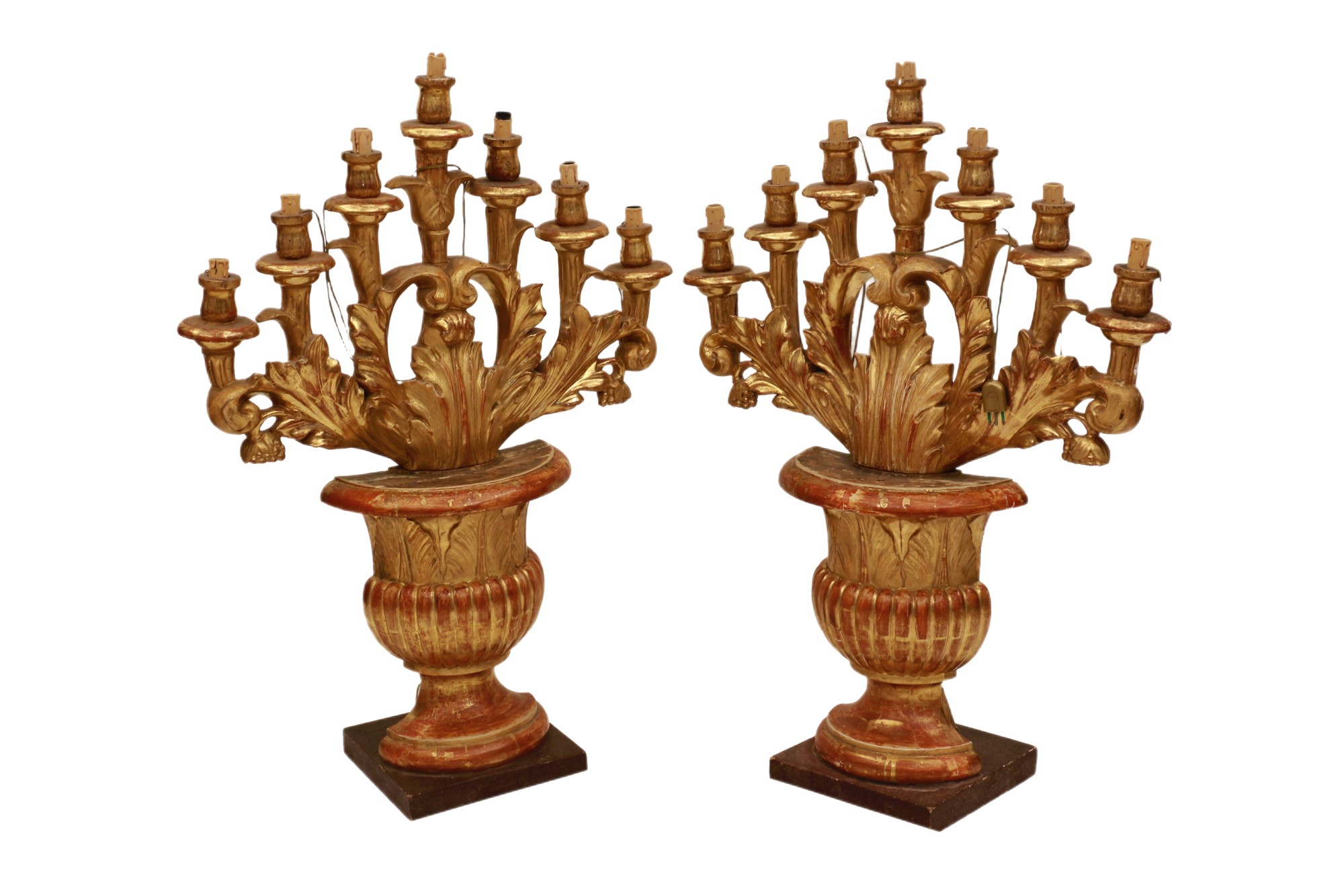 Coppia di flambeaux a 7 luci in legno dorato a foglia oro. Sicilia, XVII secolo.