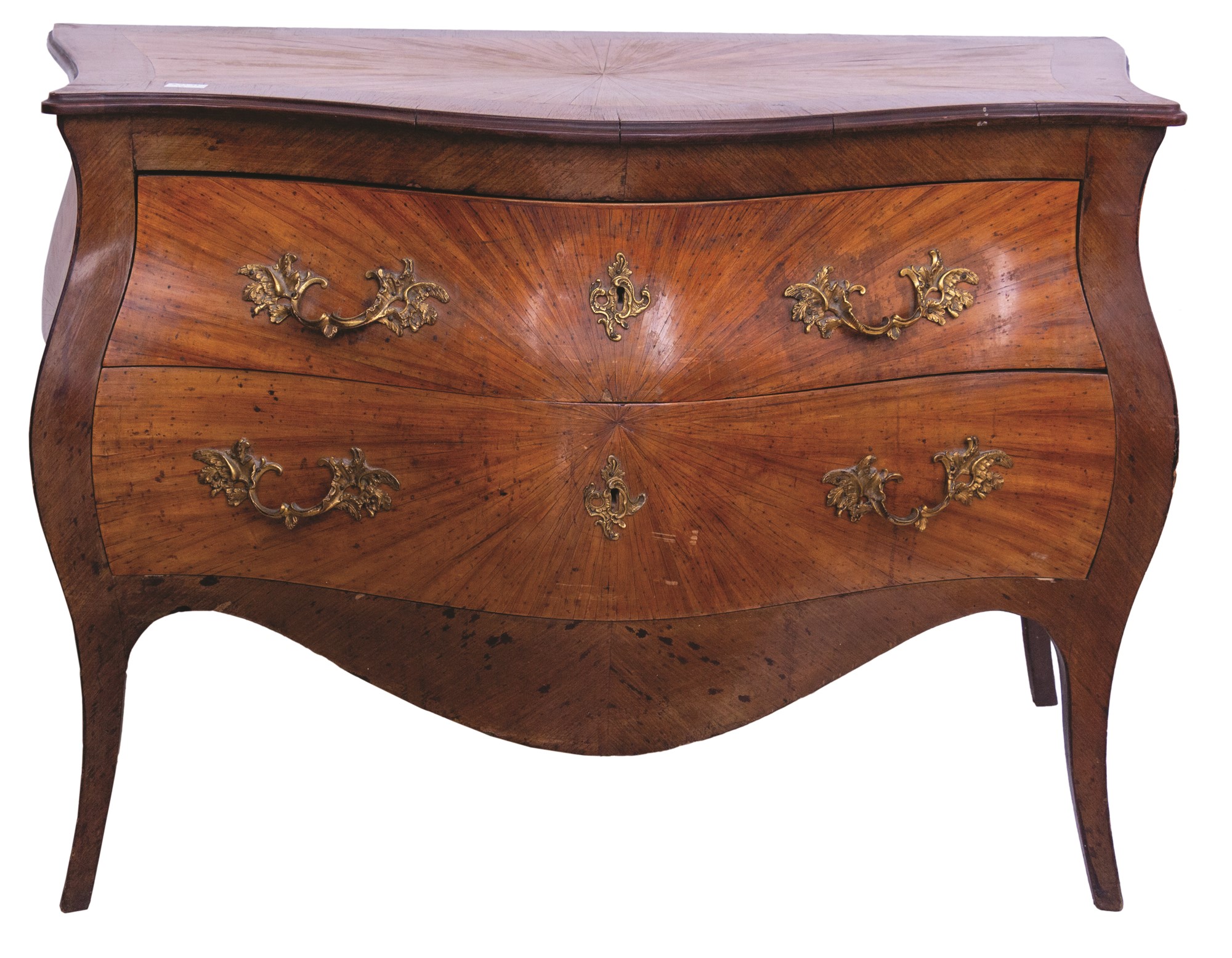 Cassettone in mogano stile Luigi XV lastronato a due cassetti con fronte e fianchi mossi. Napoli, fine XIX secolo