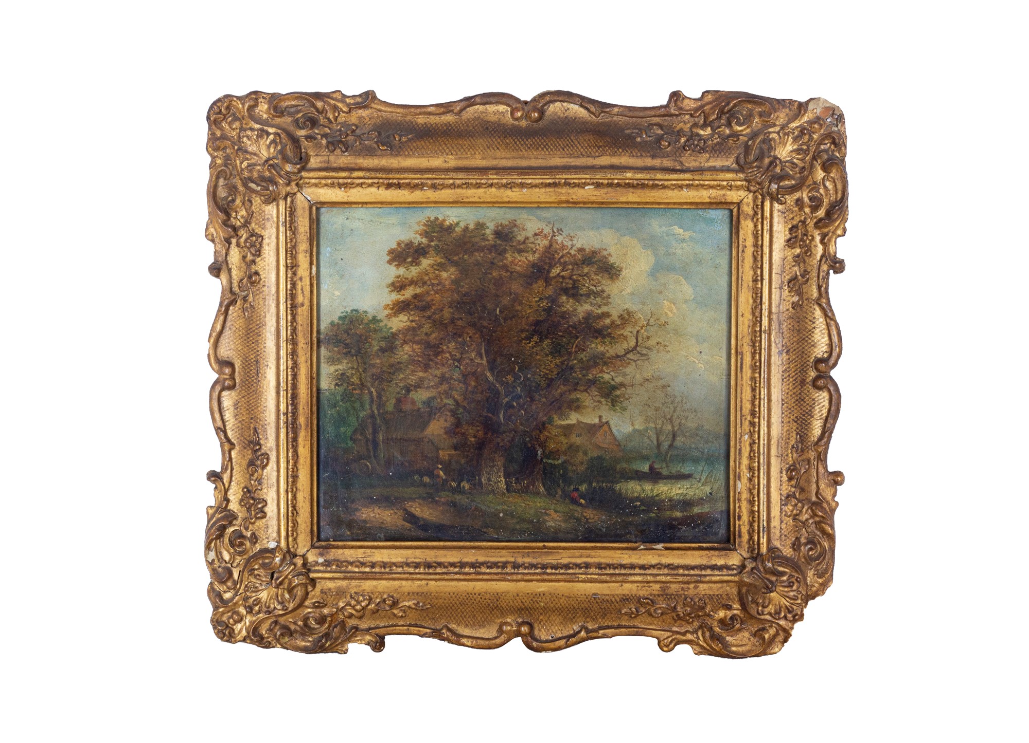 Pittore del Nord Europa del XVIII secolo Paesaggio fluviale con case e figure