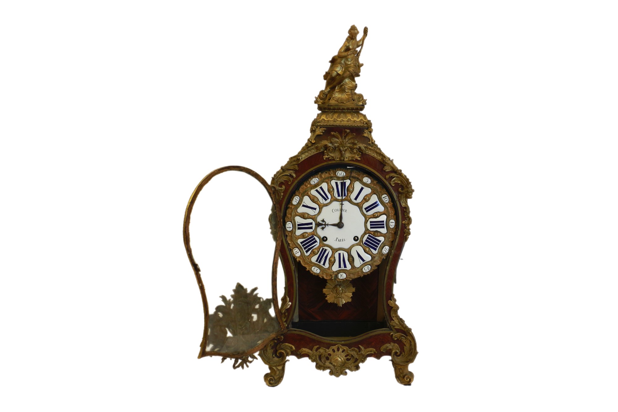 cm 97x39x18,5 Cassa sagomata lastronata in palissandro e decorata da fregi in bronzo dorato, poggiante su quattro piedi a voluta. Quadrante in smalto bianco con numerazione romana in blu per le ore e araba per i minuti. Sul quadrante scritta in smalto blu "Collier Paris".