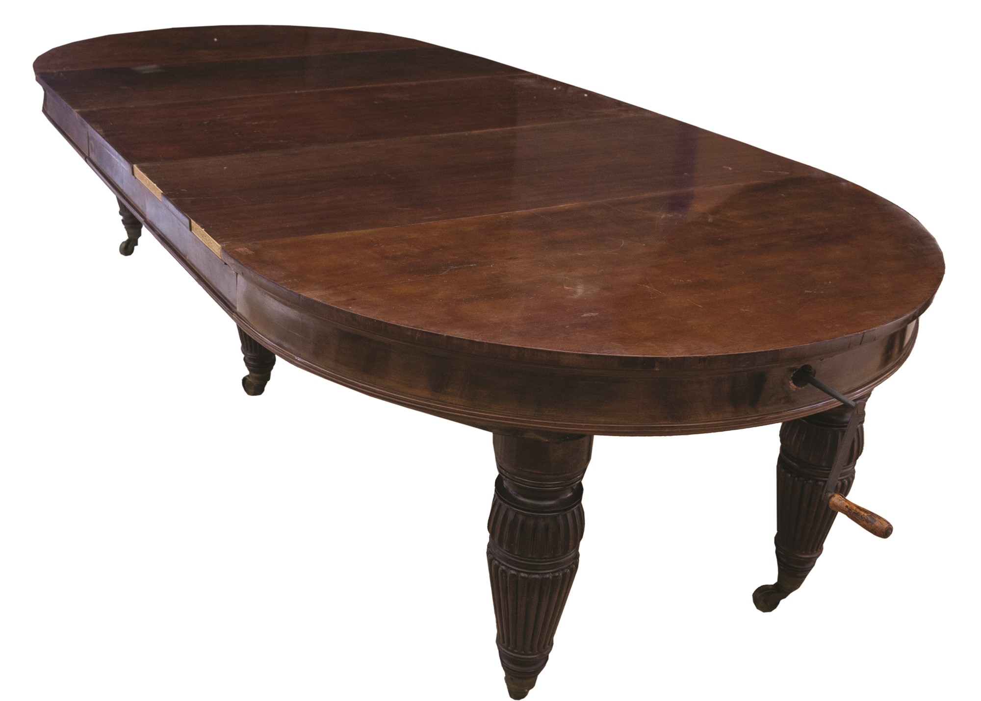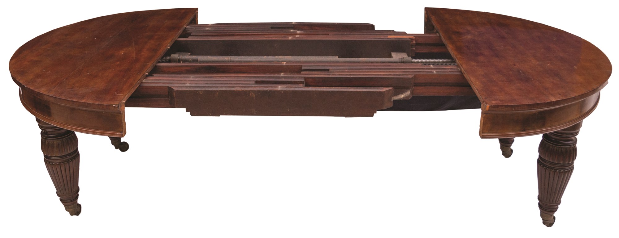 Sostenuto da gambe tornite con rotelle originali in ottone. Provvisto di tre prolunghe. Meccanismo di allungamento a manovella a doppia mandata.