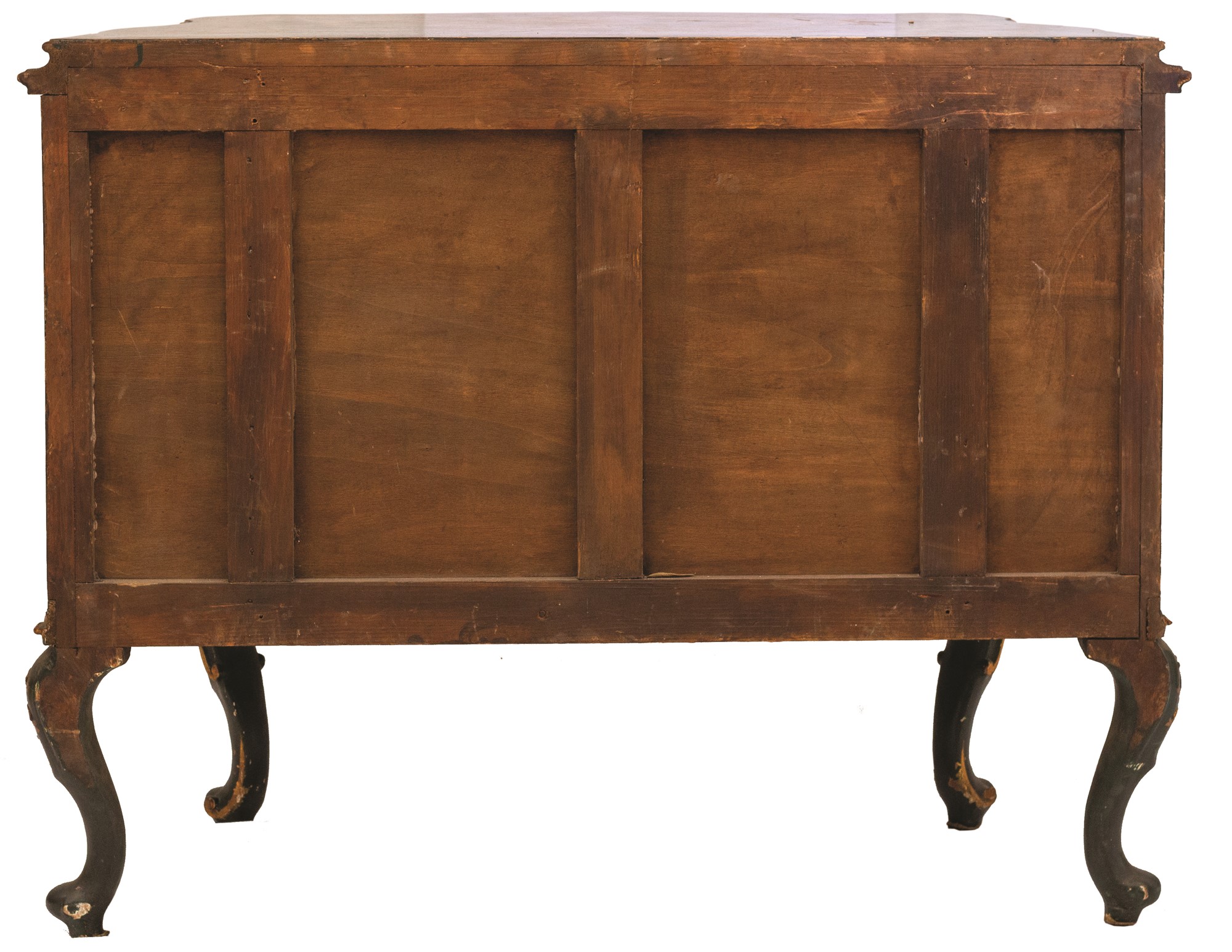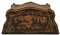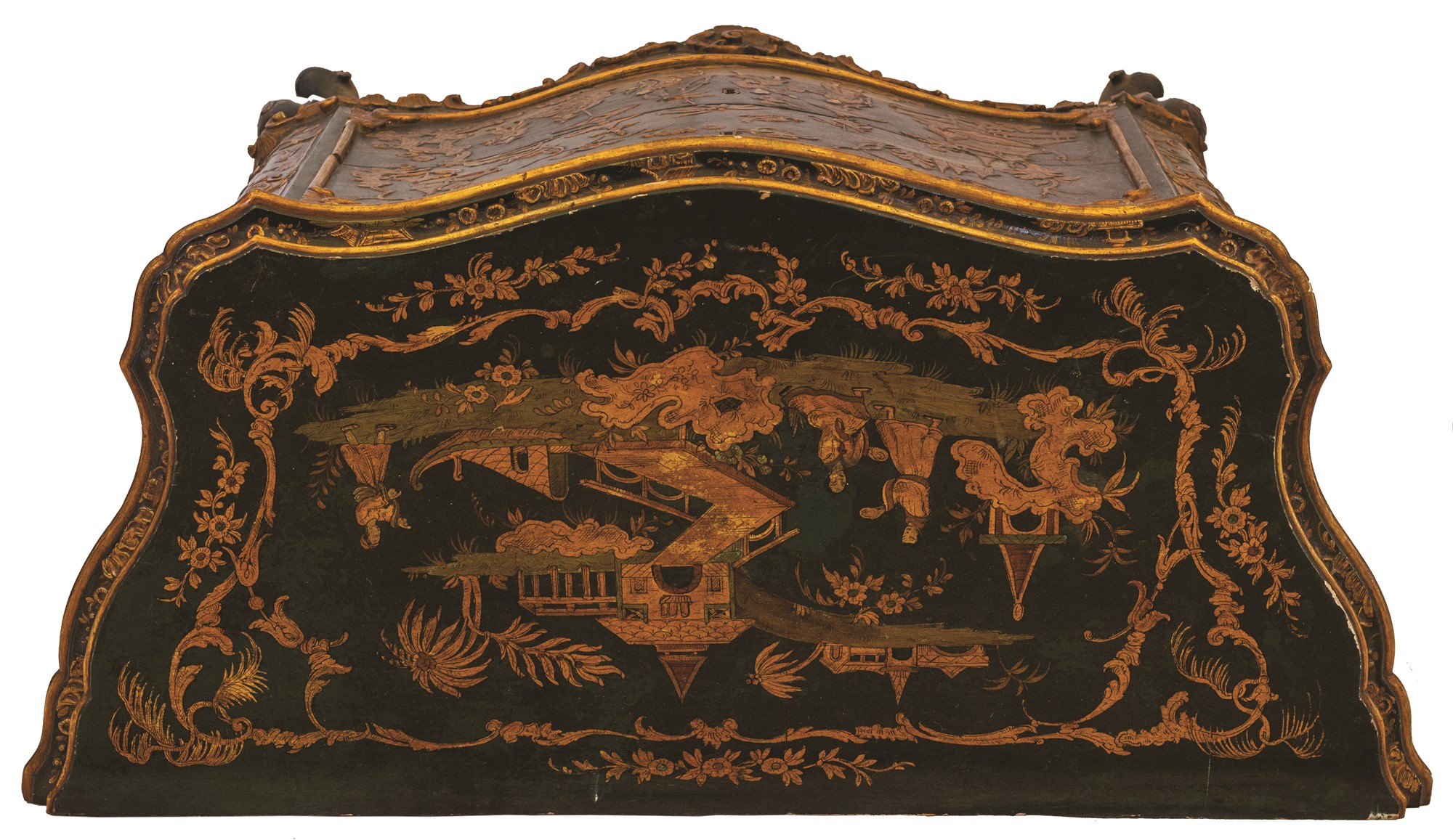 Cassettone Cina in legno laccato su fondo verde e dorato a rilievo con scene di genere e elementi vegetali fine del XX secolo