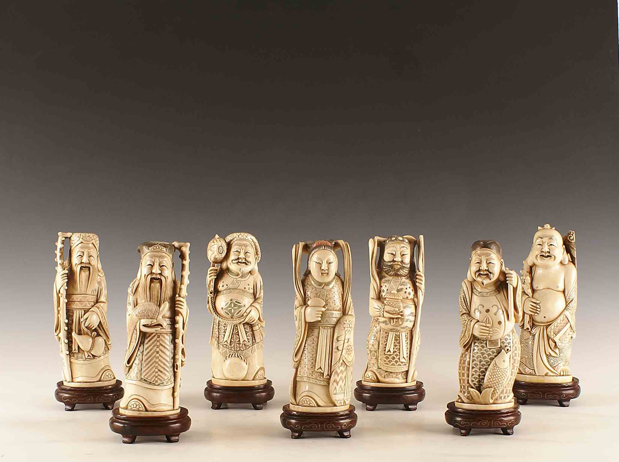 Sette sculture in avorio scolpito a tutto tondo ed inciso a raffigurare saggi...