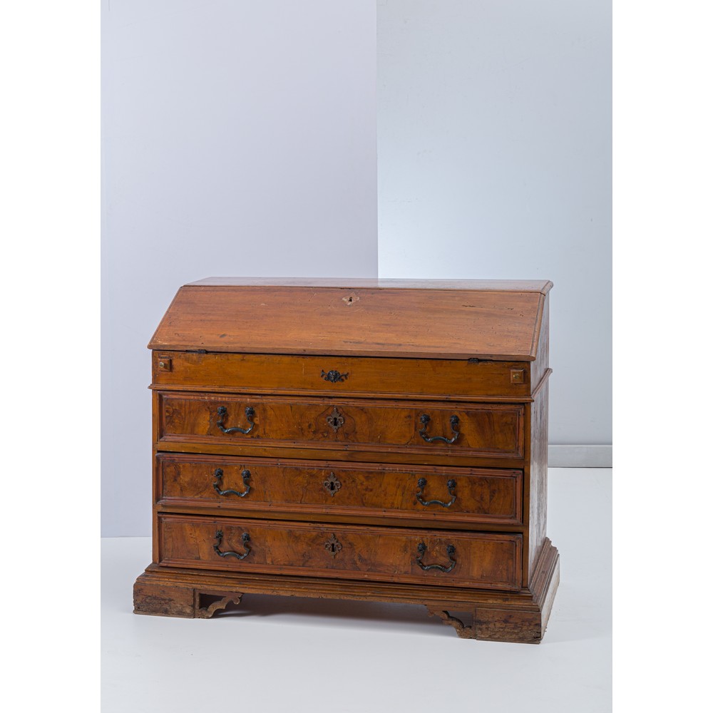 Cassettone con ribalta di epoca Luigi XIV in legno di noce e piuma di noce, composto da tre grandi cassetti con maniglie in bronzo dorato e quattro piccoli cassetti all'interno della ribalta.