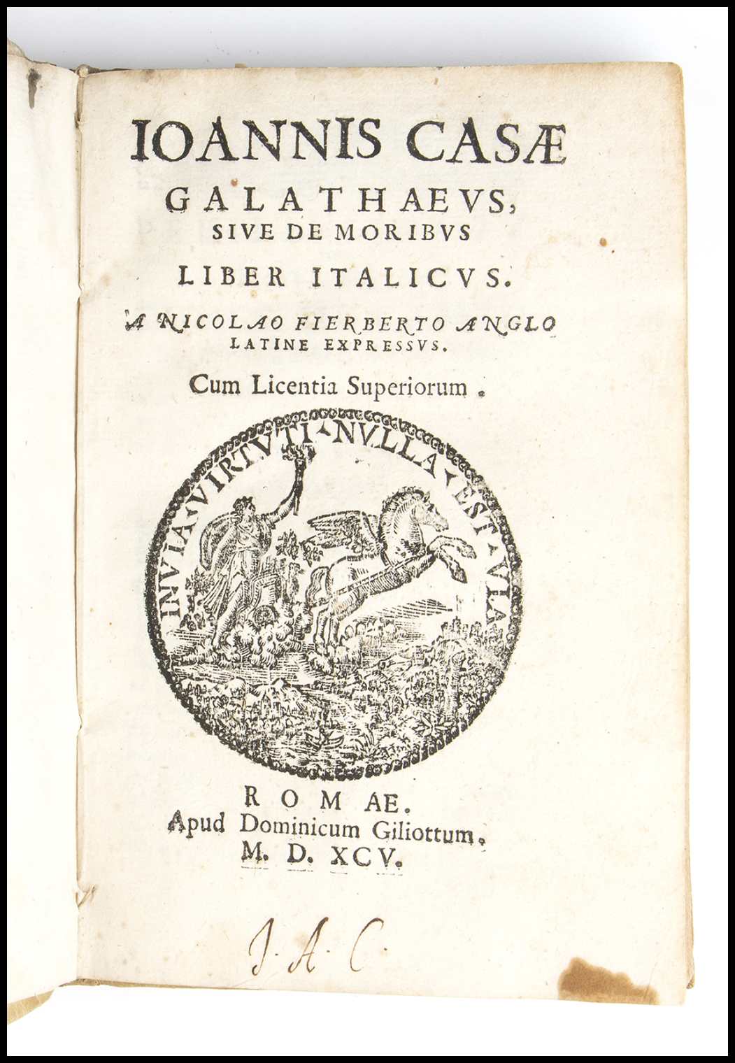 In 8. Marca xilografia al frontespizio, legatura in piena pergamena coeva. Rara traduzione in "anglo-latino", del celeberrimo trattato di Monsignor Della Casa, curata da Nicholas Fitzherbert (1550-1612).