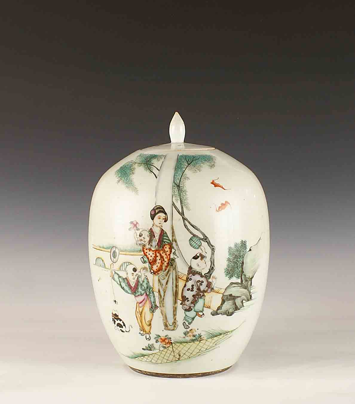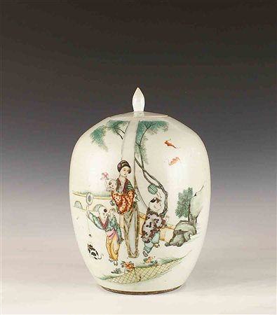 Potiche in porcellana dipinta in policromia, vecchia manifattura orientale,...