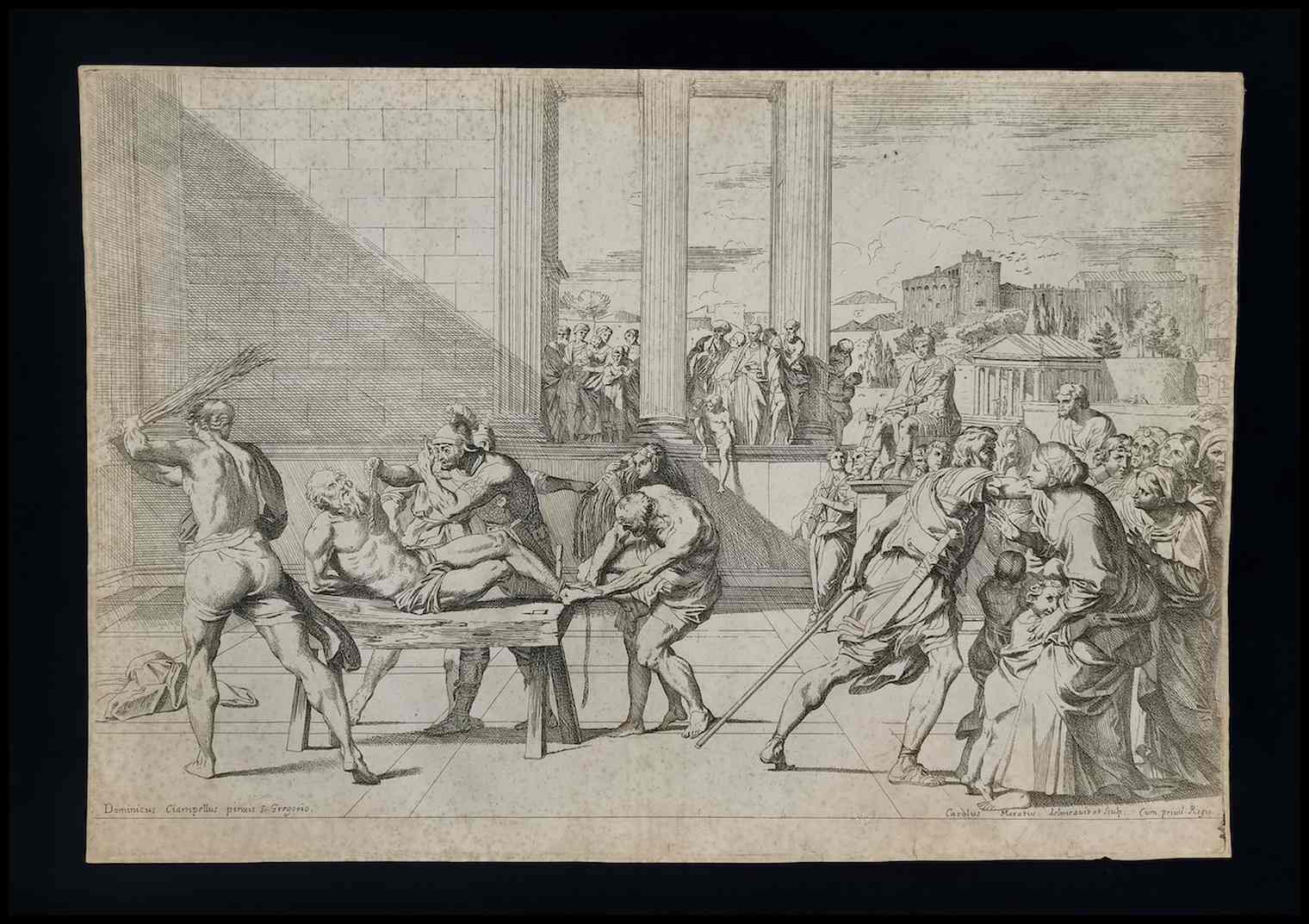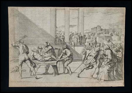 La scena, ambientata tra architetture classiche, riproduce il momento precente al martirio, quello della flagellazione del santo, legato e disteso su un tavolo con i suoi aguzzini che infieriscono su di lui; l'incisione è un II stato su V, stampata Roma 1650 ca.