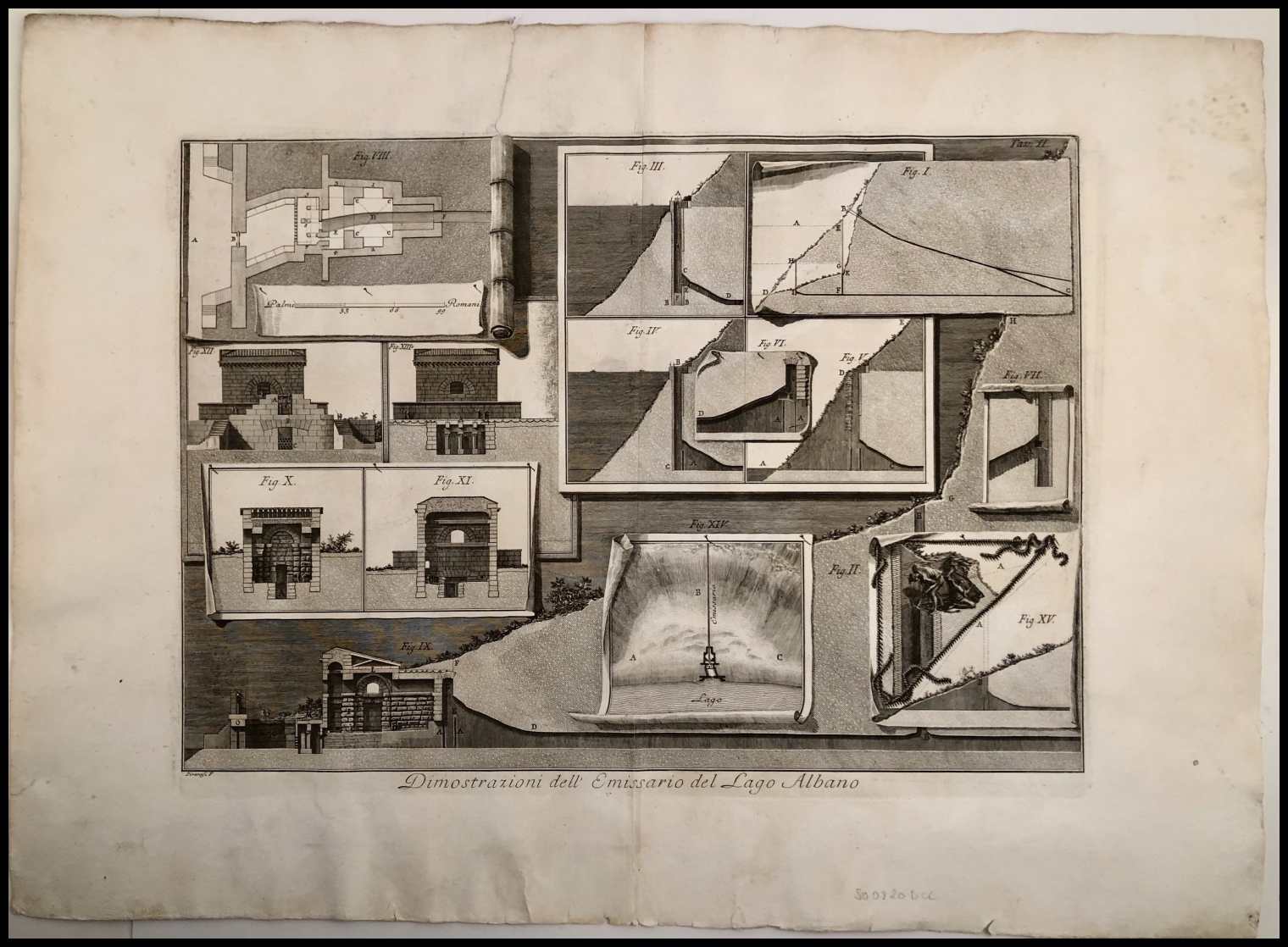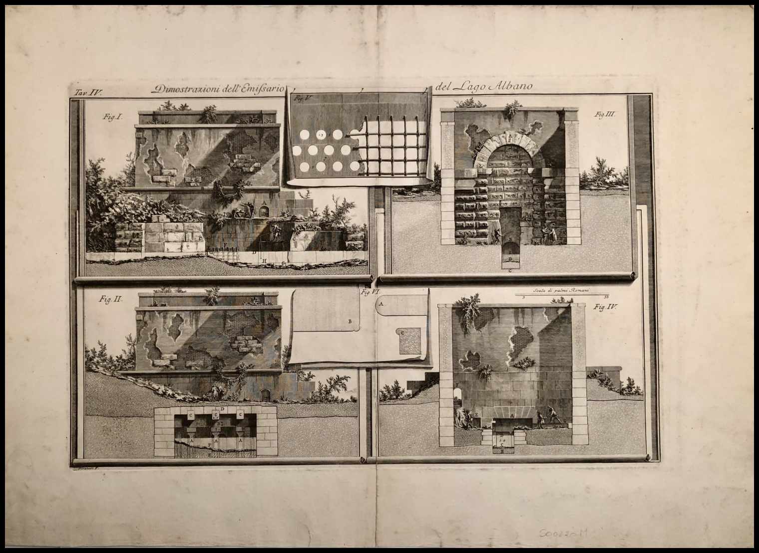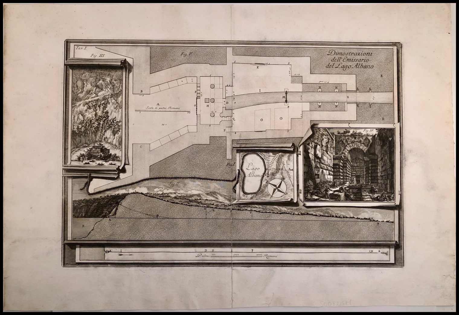 Tavola I, II e IV della serie Descrizione e disegno dell'Emissario del Lago Albano, 1762. Focillon 783