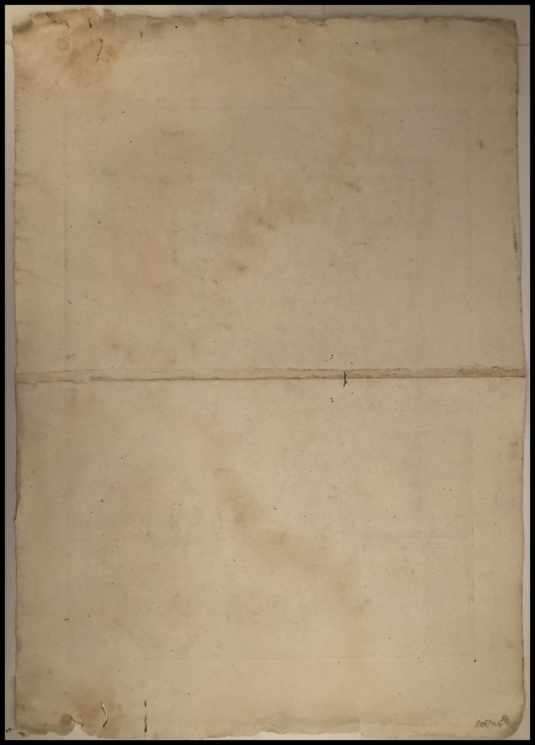 Bella impressione su due fogli di carta vergellata uniti, con fue grandi filigrane. Foglio in buono stato salvo dei fori sparsi.