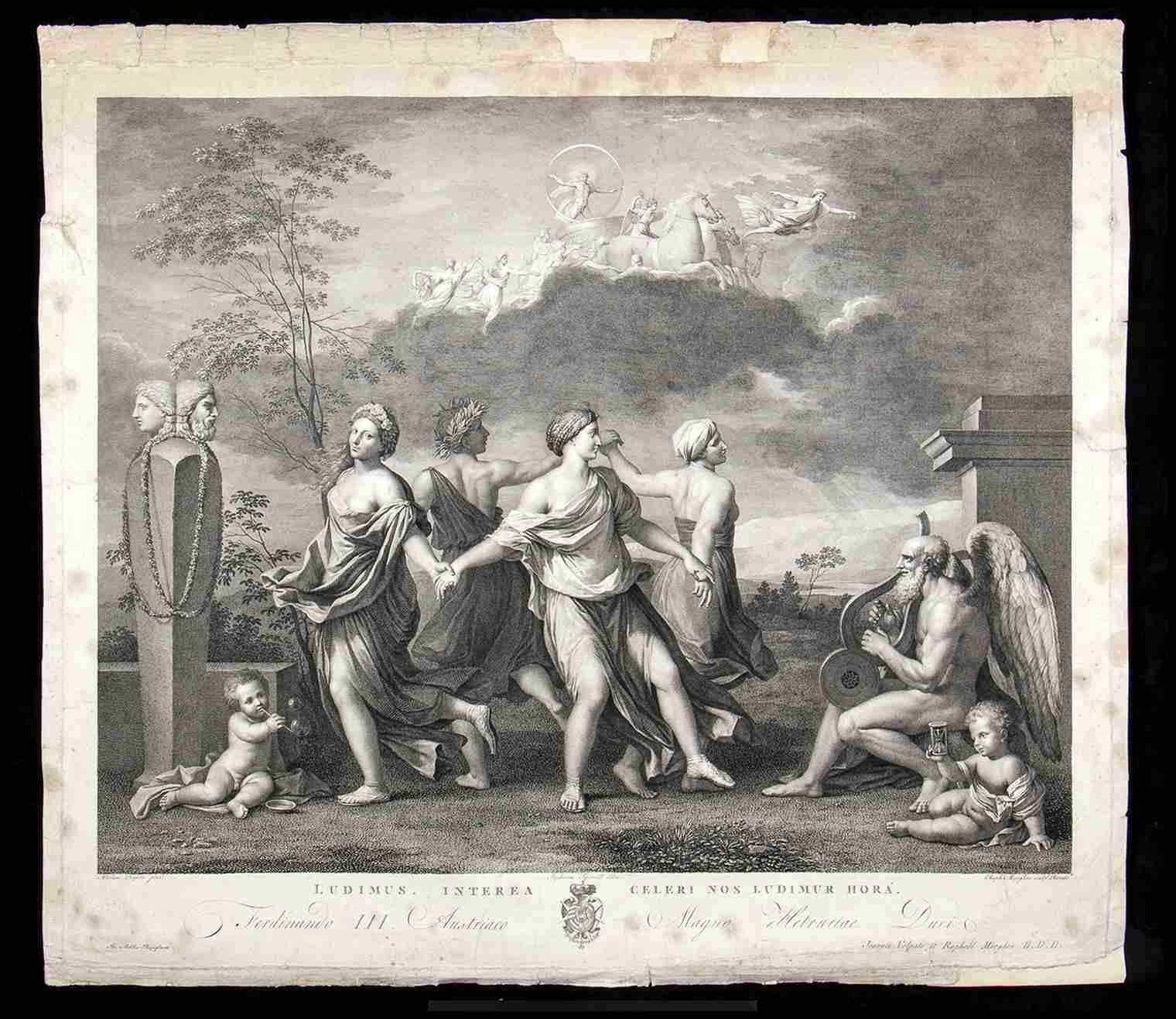 La danza delle Ore: "Ludimus. Interea celeri nos ludimor hora" acquaforte di Stafano Tofanelli (1752-1812), da un dipinto di Nicolas Poussin, oggi nella Wallace Collection di Londra, stampata da Raffaello Morghen (1758-1833) a Roma, 1787. Bellissima rappresentazione delle Ore raffigurate come giovani danzanti di fronte alle Età della vita, un'erma bifronte e un vecchio alato che suona la lira, mentre due puttini seduti in basso giocano uno con delle bolle di sapone e l'altro con la clessidra, a significare la fugacità del tempo e delle cose terrene. Sovrasta la scena il magnifico carro di Apollo con il cerchio del Sole, che simboleggia il movimento costante dell'Universo. Buone condizioni generali con restauri e mancanze ai bordi; mm 650x565