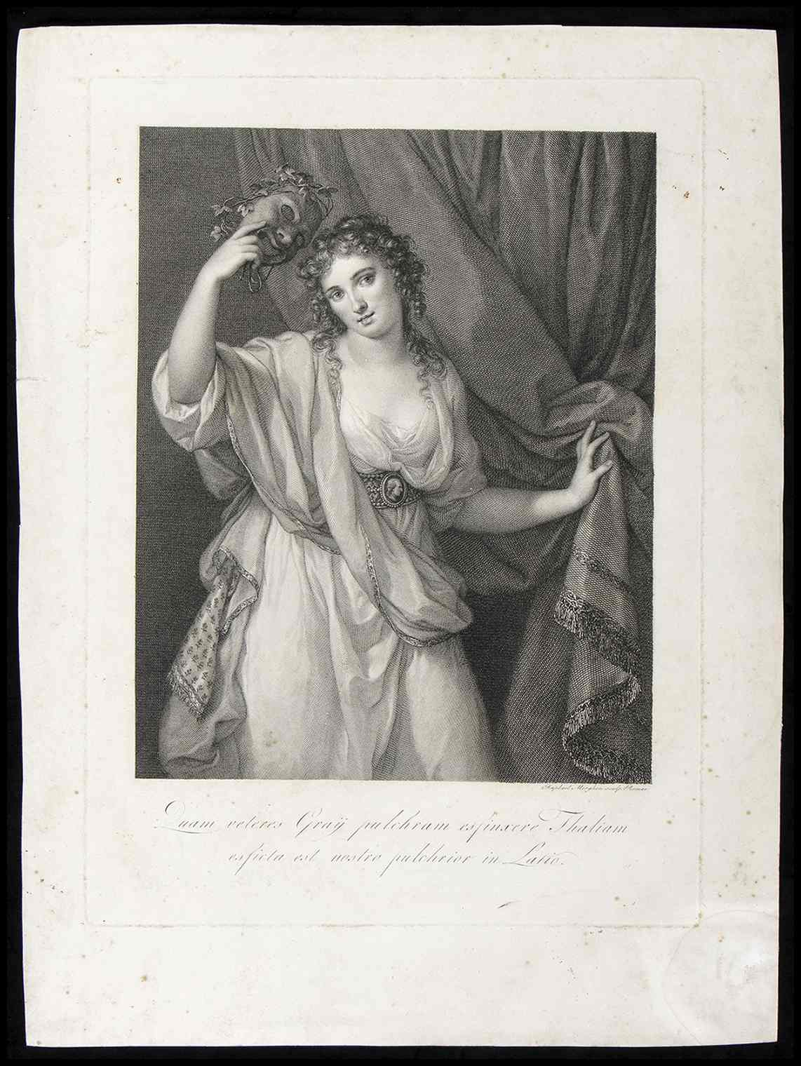 acquaforte di Raffaello Morghen, dal dipinto di Angelika Kauffmann (1741-1807), stampata a Roma 1797; l’incisione è in realtà il ritratto di Emma Hartt (1761-1815), poi Lady Hamilton nei panni di Thalia, la Musa della commedia greca. Donna di notevole bellezza e fascino, celebre anche per il suo temperamento indipendente per l’epoca, ebbe numerose relazioni, tra cui con il pittore Georges Romney e la più scandalosa con Orazio Nelson, dopo il matrimonio con l’ambasciatore inglese a Napoli, sir William Hamilton; viene ritratta come l’incantevole Musa della commedia, nell’atto di togliersi la maschera dal viso, mentre scosta la tenda di un sipario, con un elegante abito bianco con un cammeo alla cintura e fusciacca con orlo ricamato