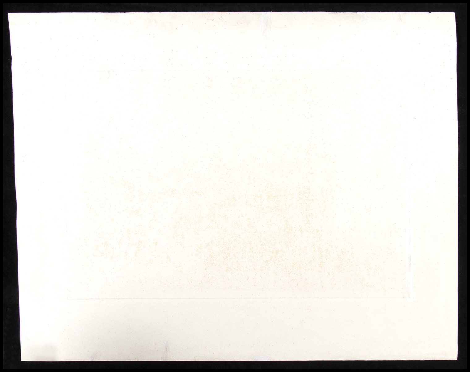 acquaforte a tre colori, di grande dimensione, stampata su carta pesante avorio, firmata a a matita in basso a destra, fuori dall'immagine ma entro il margine lastra. Esemplare in ottime condizioni vista la grande dimensione del foglio, che però presenta degli strappi restaurati, al margine superiore e ai lati.
