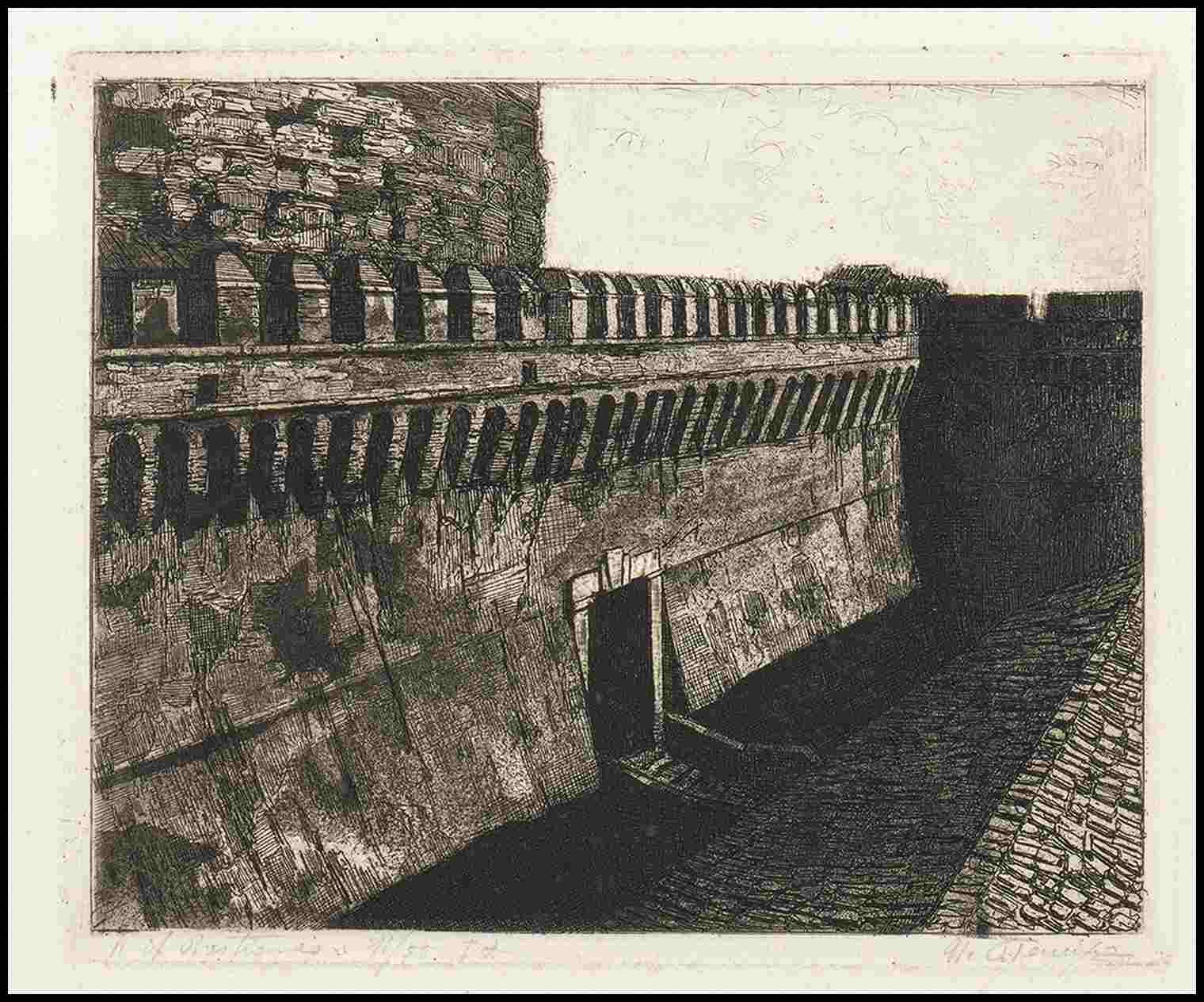 Bellissima incisione di Prencipe, che mostra uno dei bastioni di Castel S. Angelo a Roma, ritratto con tutta la tipica varietà chiaroscurale che contraddistingue le sue opere; il tratteggio fittissimo o assente consente di ottenere dettagli anche piccolissimi. Prova eccellente, una delle prime stampate sui 50 esemplari della I serie. Umberto Prencipe (Napoli, 1879- Roma, 1962), fu pittore e incisore estremamente attivo durante tutto l’arco della sua vita. La sua passione per il vedutismo con elementi architettonici, è strettamente legata alla sua personalità solitaria, con una sensibilità che lo avvicina alle tendenze crepuscolari e simboliste del primo Novecento. Furono gli anni giovanili trascorsi a Roma frequentando l’Accademia di BBAA, quelli in cui iniziò a conoscere a fondo le tecnica dell’incisione, di cui diventerà un esponente di grande livello, diventando promotore del Gruppo Romano Incisori Artisti e del Collegio Orvietano delle Arti.