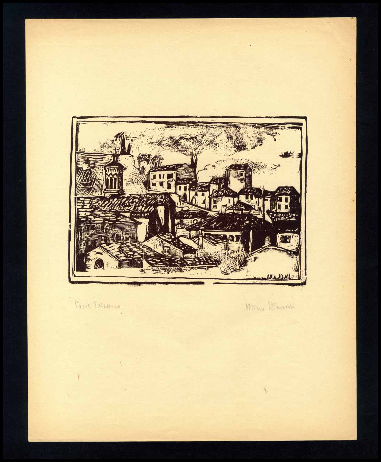 Mino Maccari (1898-1989) Paese Toscano xilografia, cm 24x31 Caratteristico...