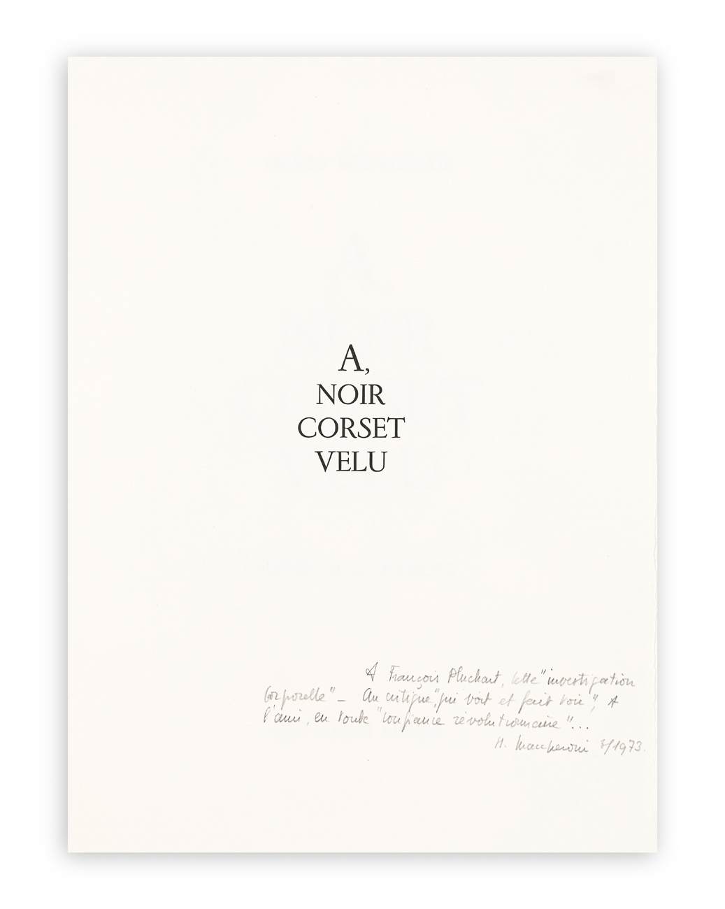 Edizione d'arte composta da 126 pagine recanti poesie di Pierre Bourgeade illustrate da 19 stampe originali (fotografie erotiche) ai sali d'argento di Henri Maccheroni, ciascuna firmata a matita al fronte, sul supporto cartaceo