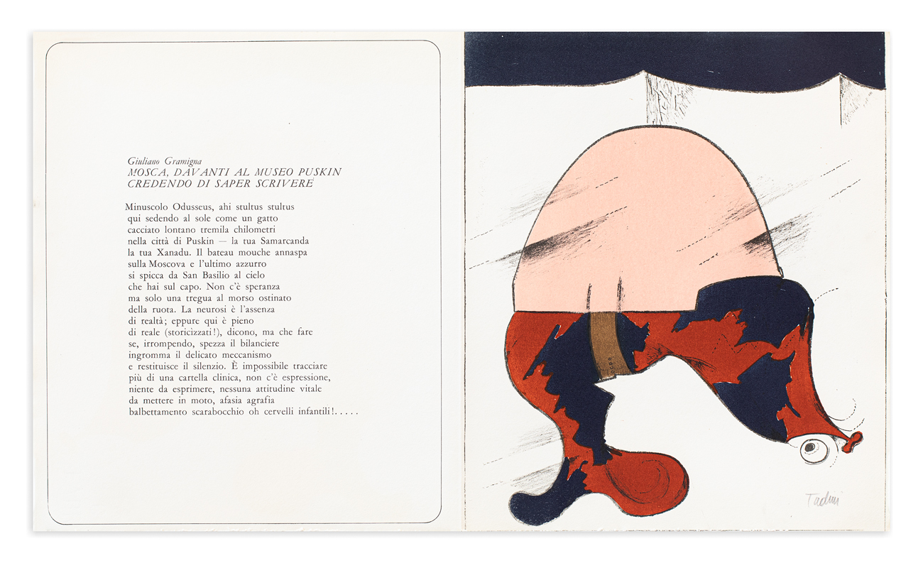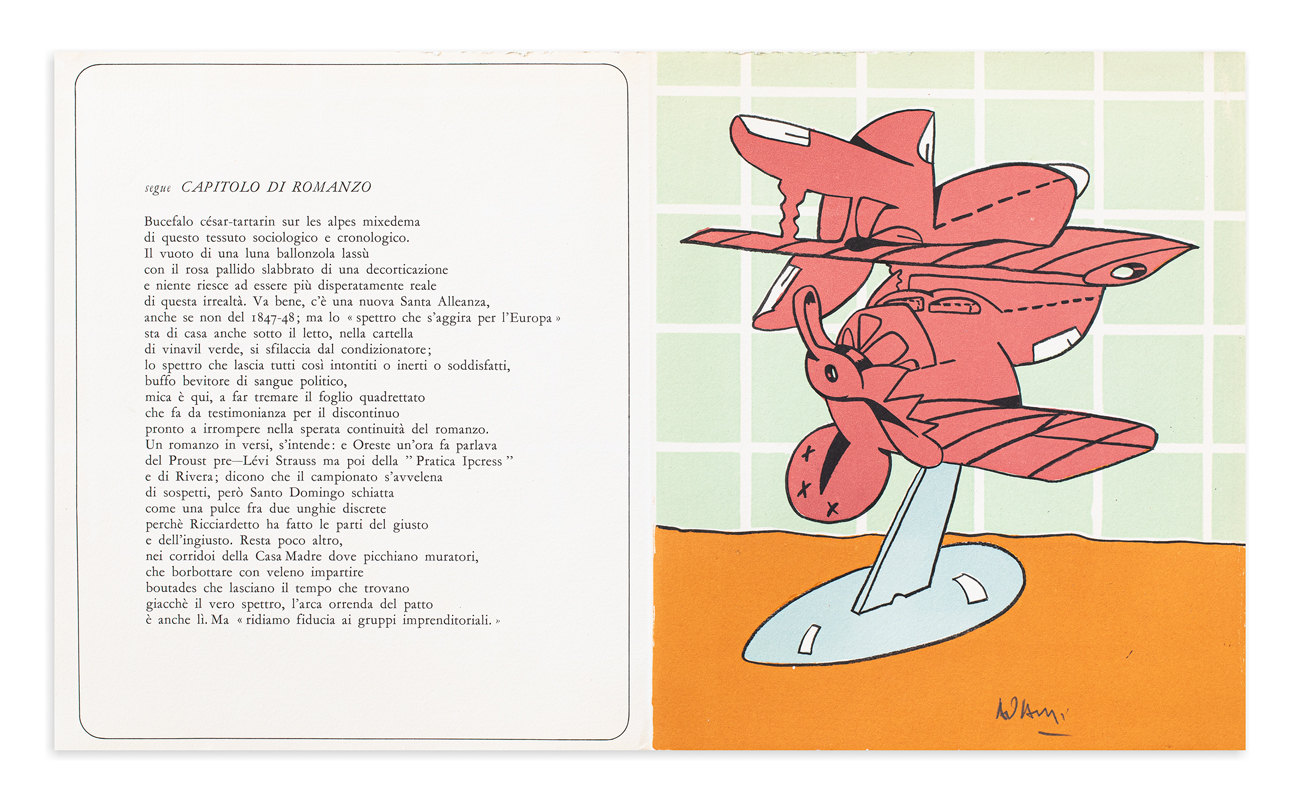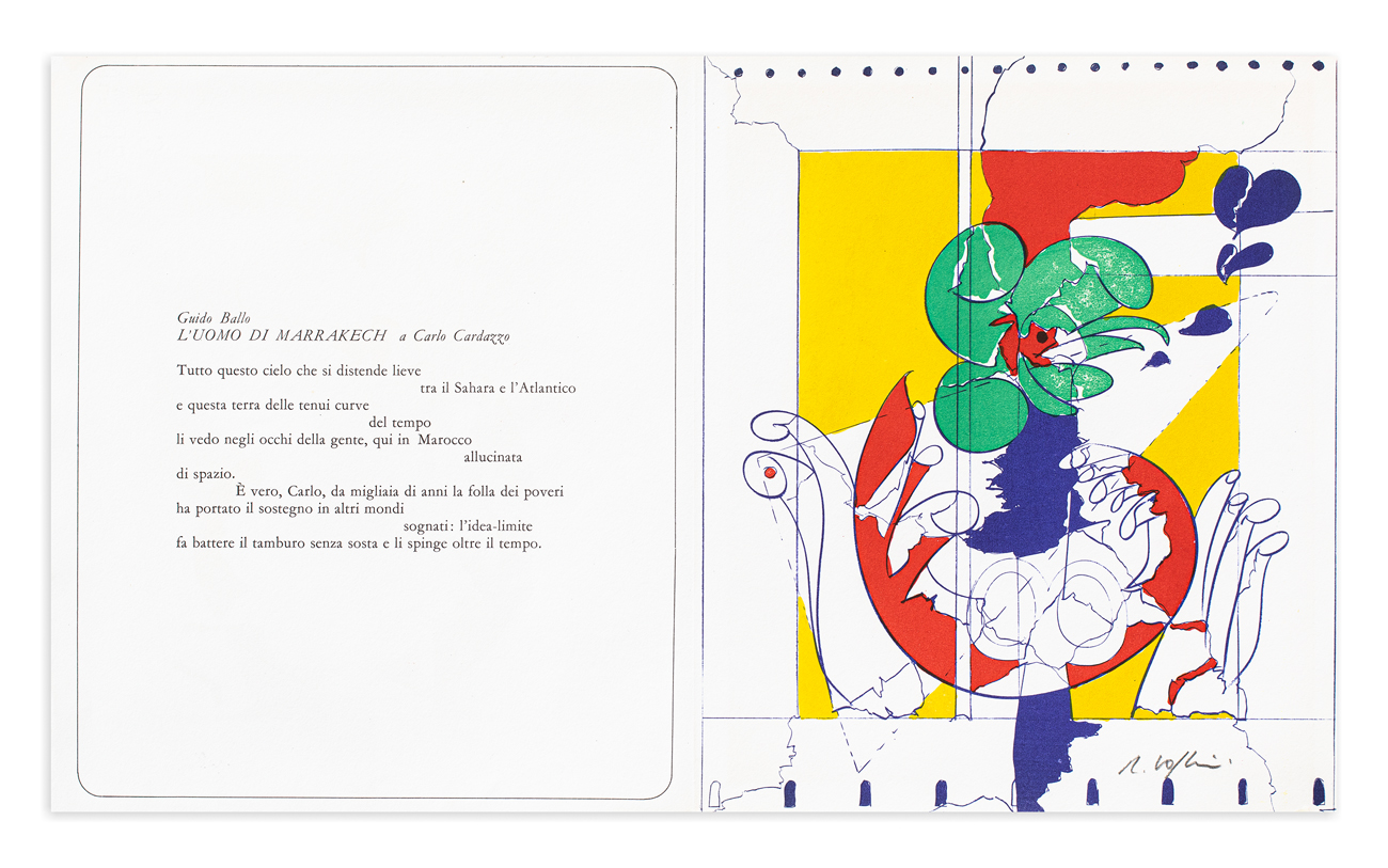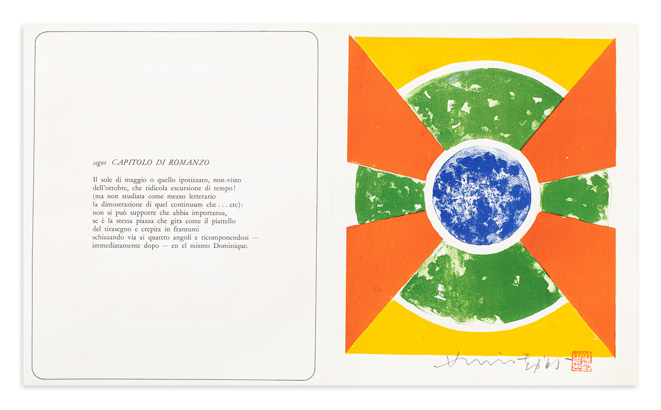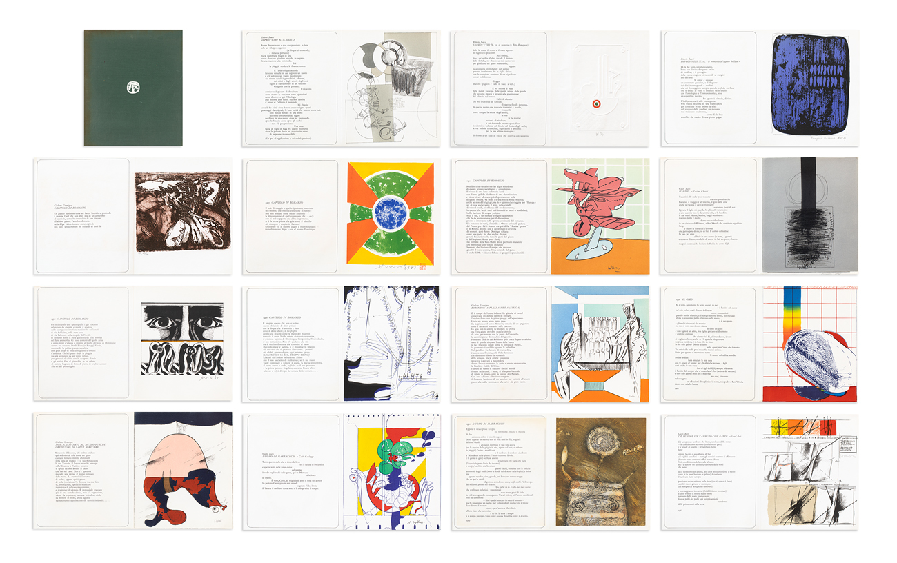 Cofanetto contente 15 litografie e acqueforti originali dei seguenti artisti: Kengiro Azuma, Giacomo Benevelli, Lucio Del Pezzo, Luciano De Vita, Hsiao Chin, Valerio Adami, Concetto Pozzati, Mario Schifano, Mario Rossello, Emilio Tadini, Renato Volpini, Enrico Baj, Emilio Scanavino, Rodolfo Aricò, Giò Pomodoro