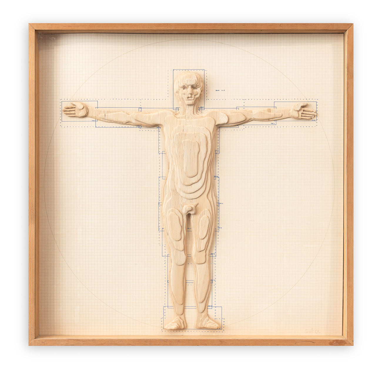Scultura in legno di balsa, sagomata e sovrapposta, applicata su carta quadrettata serigrafata, entro cassetta originale in legno