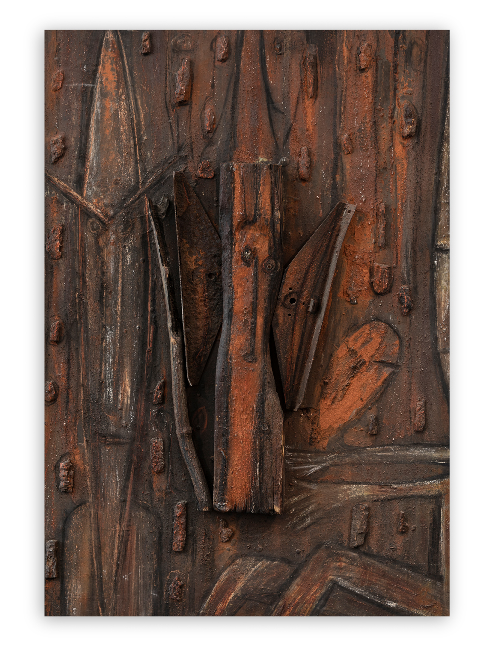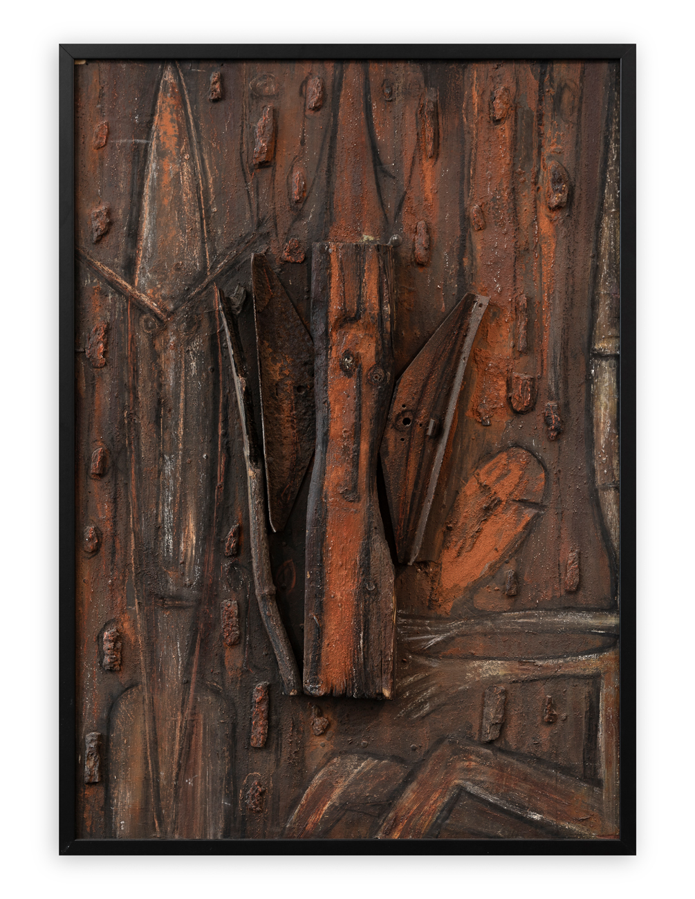 Tecnica mista e applicazioni di legno e ferro su tavola
