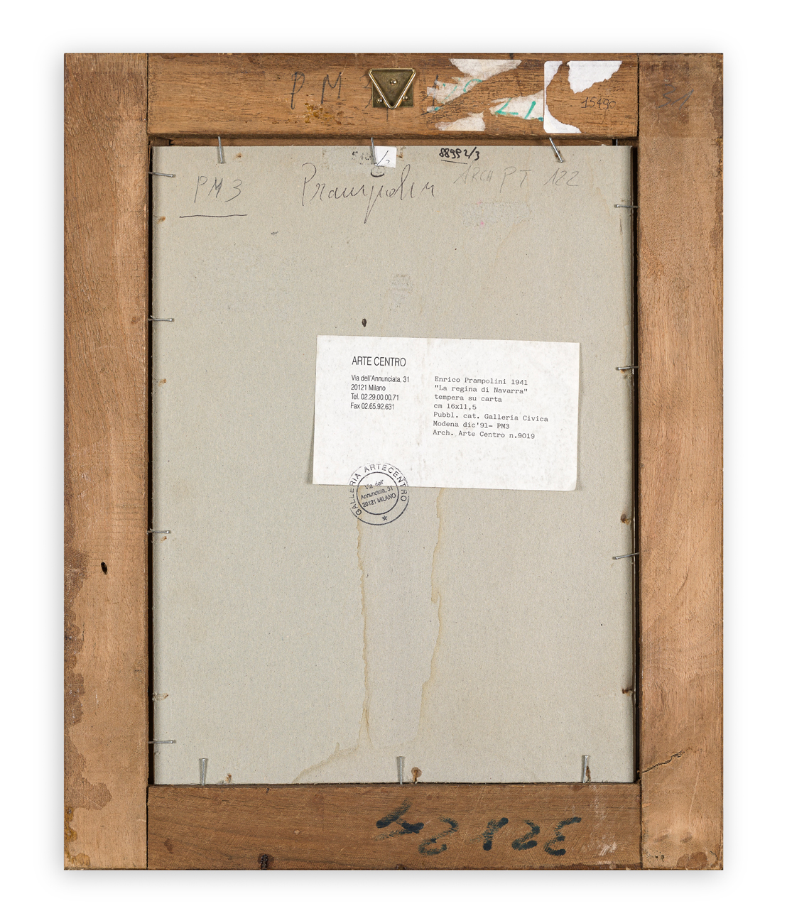 Etichetti e timbro della Galleria Artecentro (MI) al retro del cartone protettivo