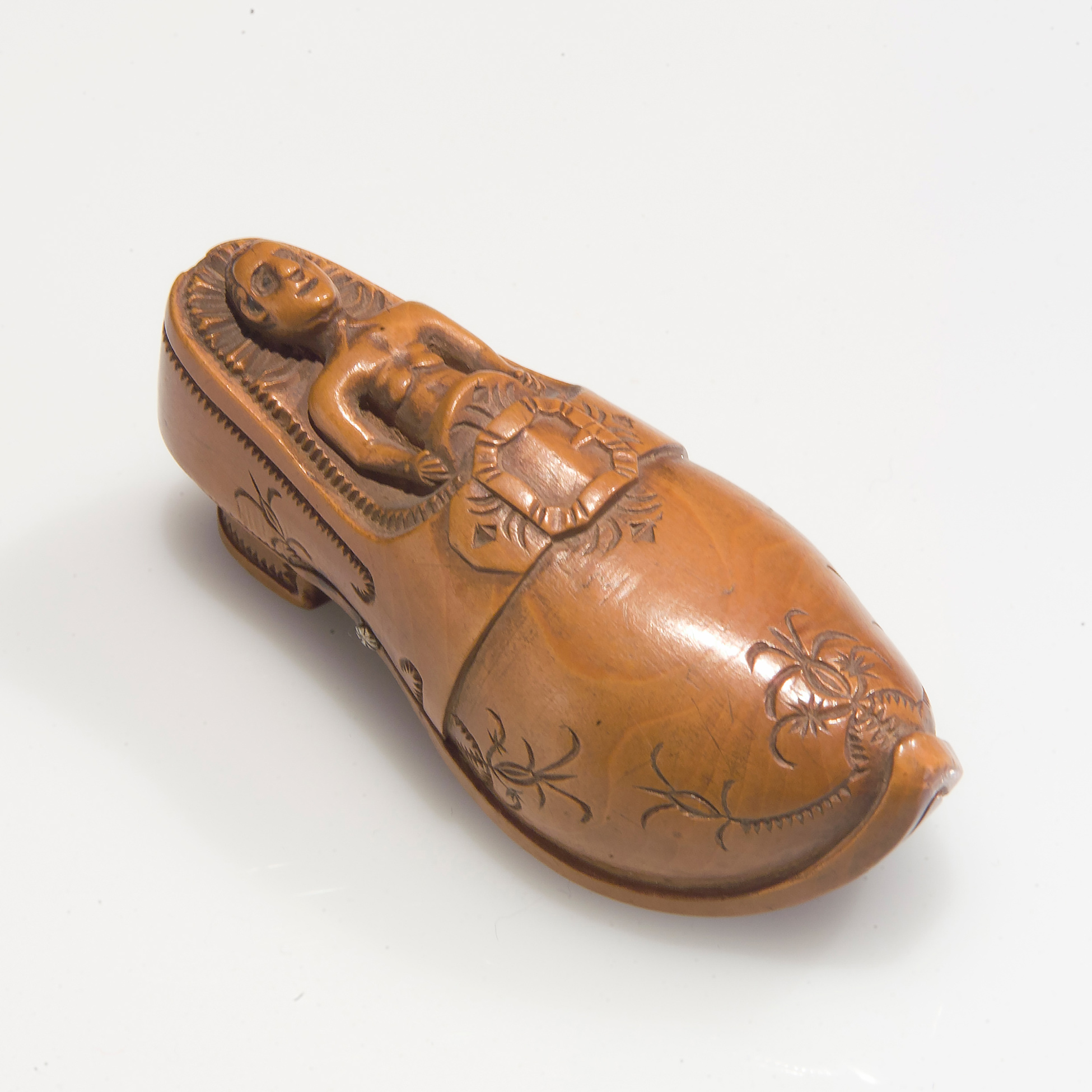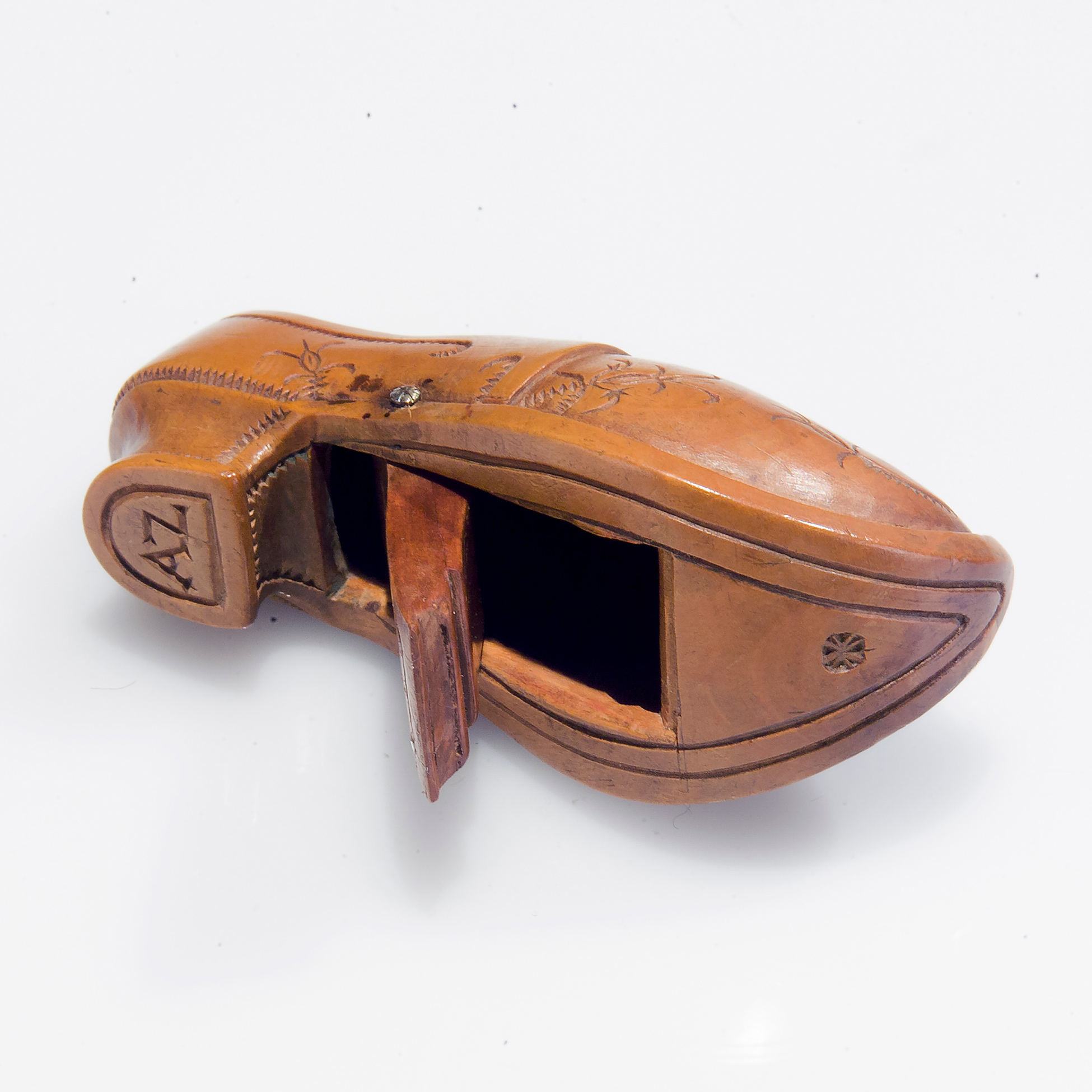 In forma di scarpa, presenti iniziali 'AZ' sul fondo. Dimensioni complessive 7.5x3x3 cm.