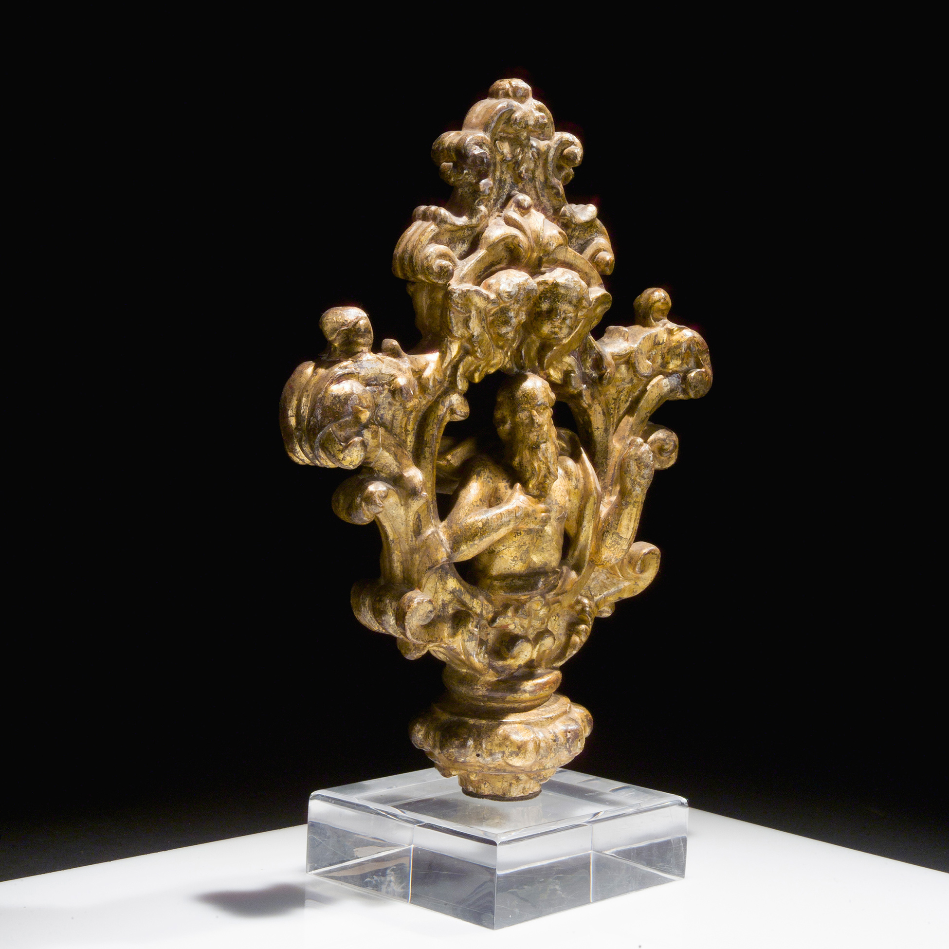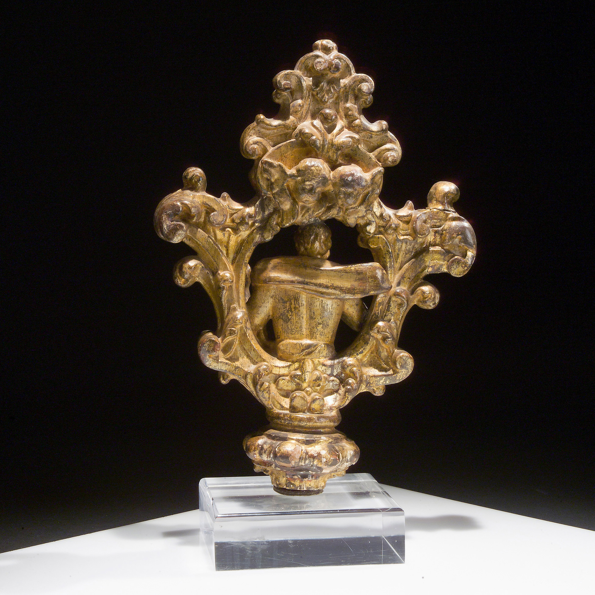 Antico puntale in legno dorato, dotato di base in plexiglass. Dimensioni complessive 37x23.5x11.5 cm.