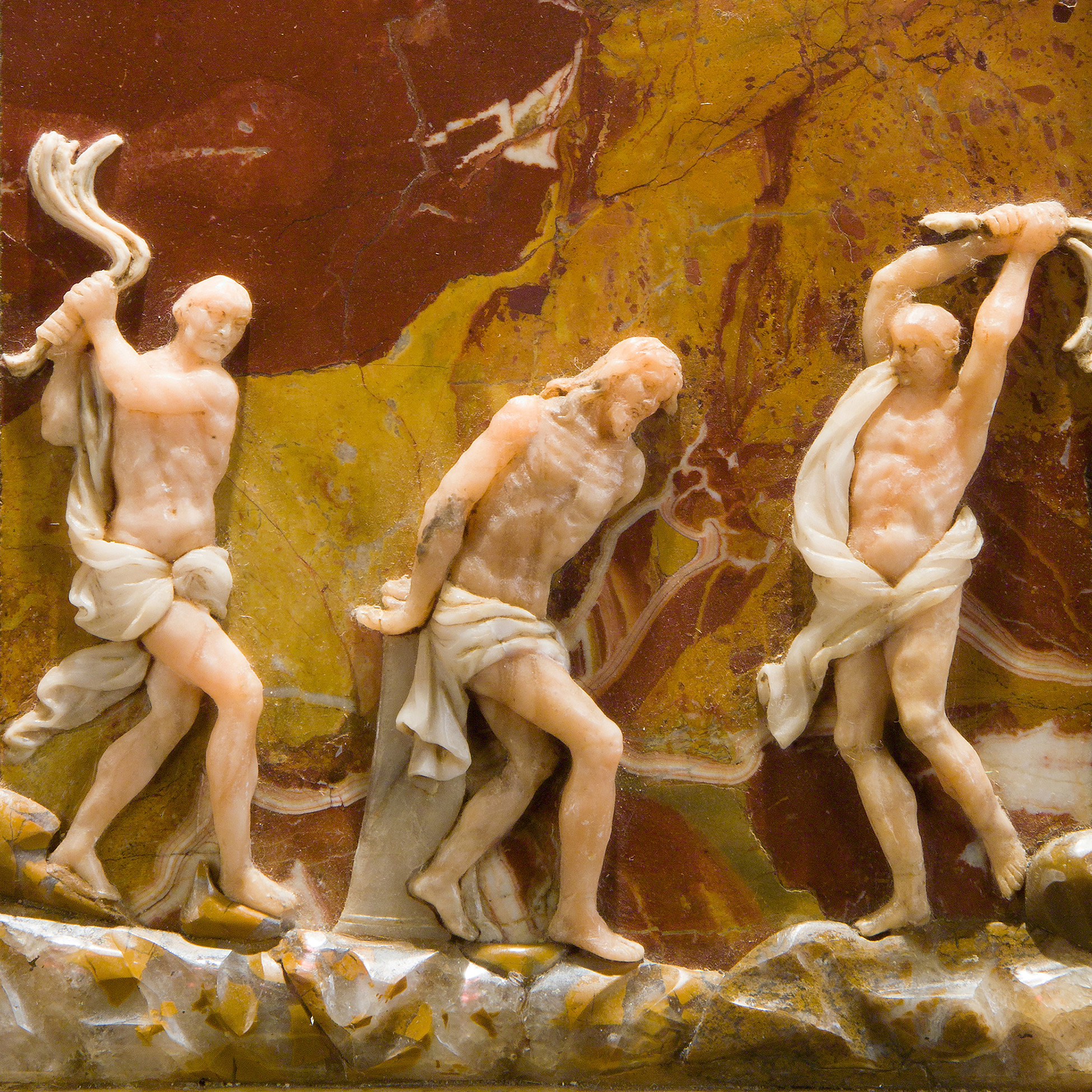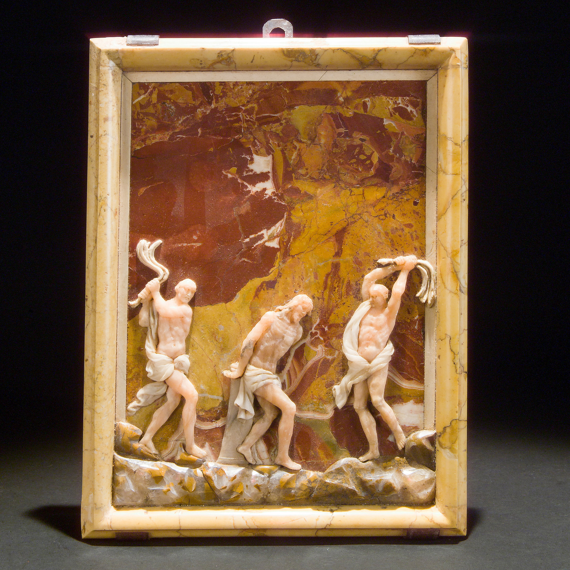 Bassorilievo in pietre dure e alabastro rosa, comunemente conosciuto come 'pietra incarnata', vede nel Tipa uno dei più pregevoli intagliatori della seconda metà del Settecento, virtuoso intagliatore di opere in avorio, ambra e alabastro. Dimensioni complessive 30x22x3.5 cm.