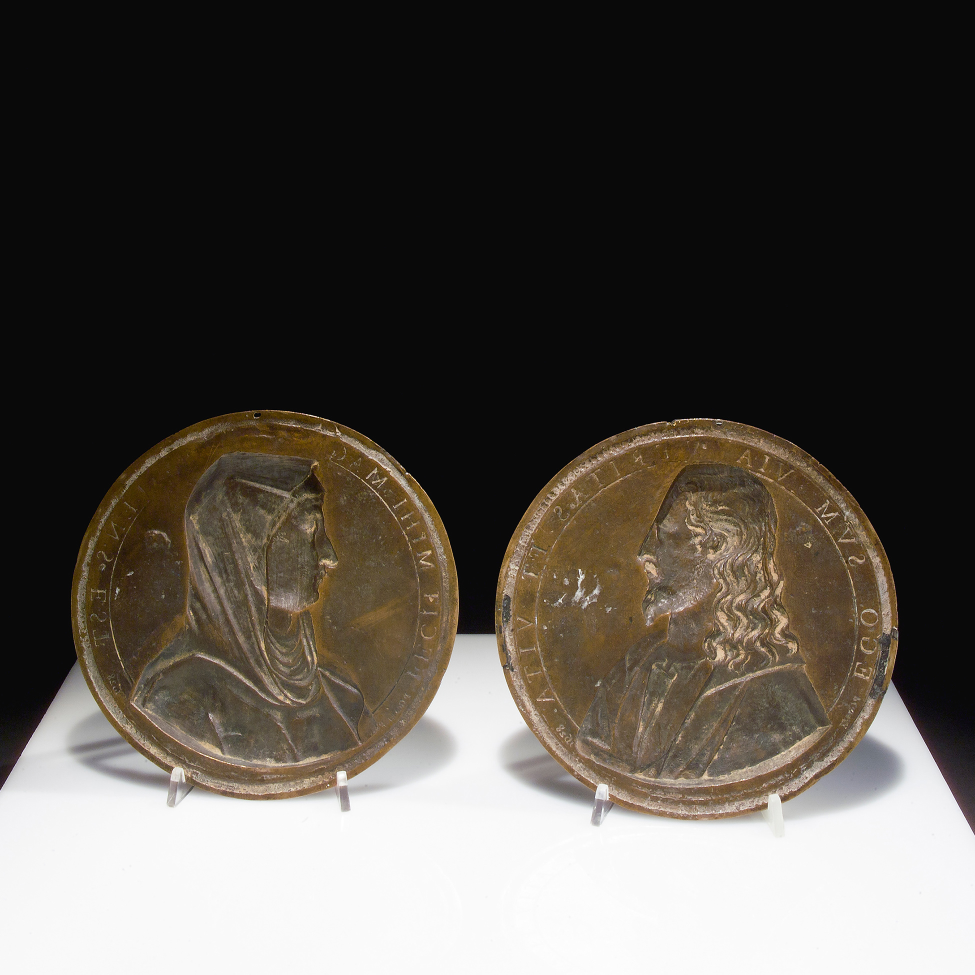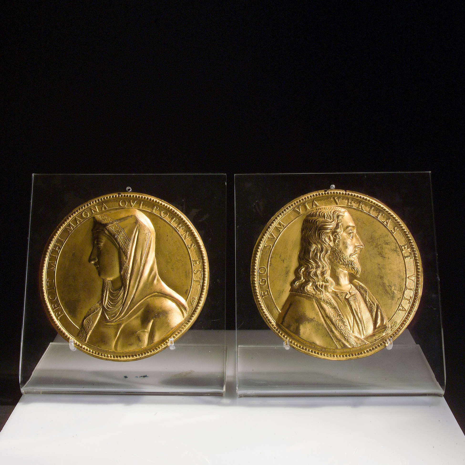 Raffiguranti Cristo e la Vergine Maria, dotati di supporto il plexiglass. Diametro 19.5 cm. cad.