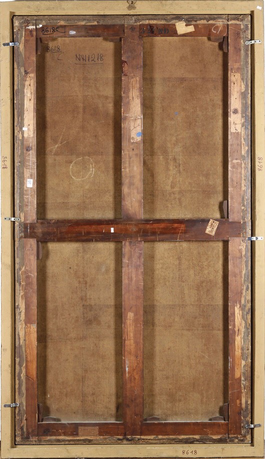 iscrizione:"BRUSETINA VIGET MIHI CLARO / NOMINE LAURUS / PRAE RELIQUIS ANA ME GE- /NUISSE SATIS", firmato e datato: "SOCERAE LECTISS.AE : HIER.S FRIGIMELICA / AN. MDCLV", olio su tela, Largh. 112 - Alt. 203 Cm, Expertise Prof. Filippo Pedrocco