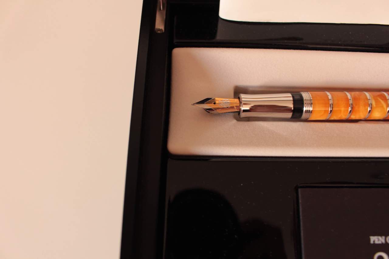 Platinum-plated endpiece, cap, & rings, amber bands. Fine 18K two-tone gold nib, F. Maker's presentation box, outer packaging, certification card. Provenance: Private Collection, Italy