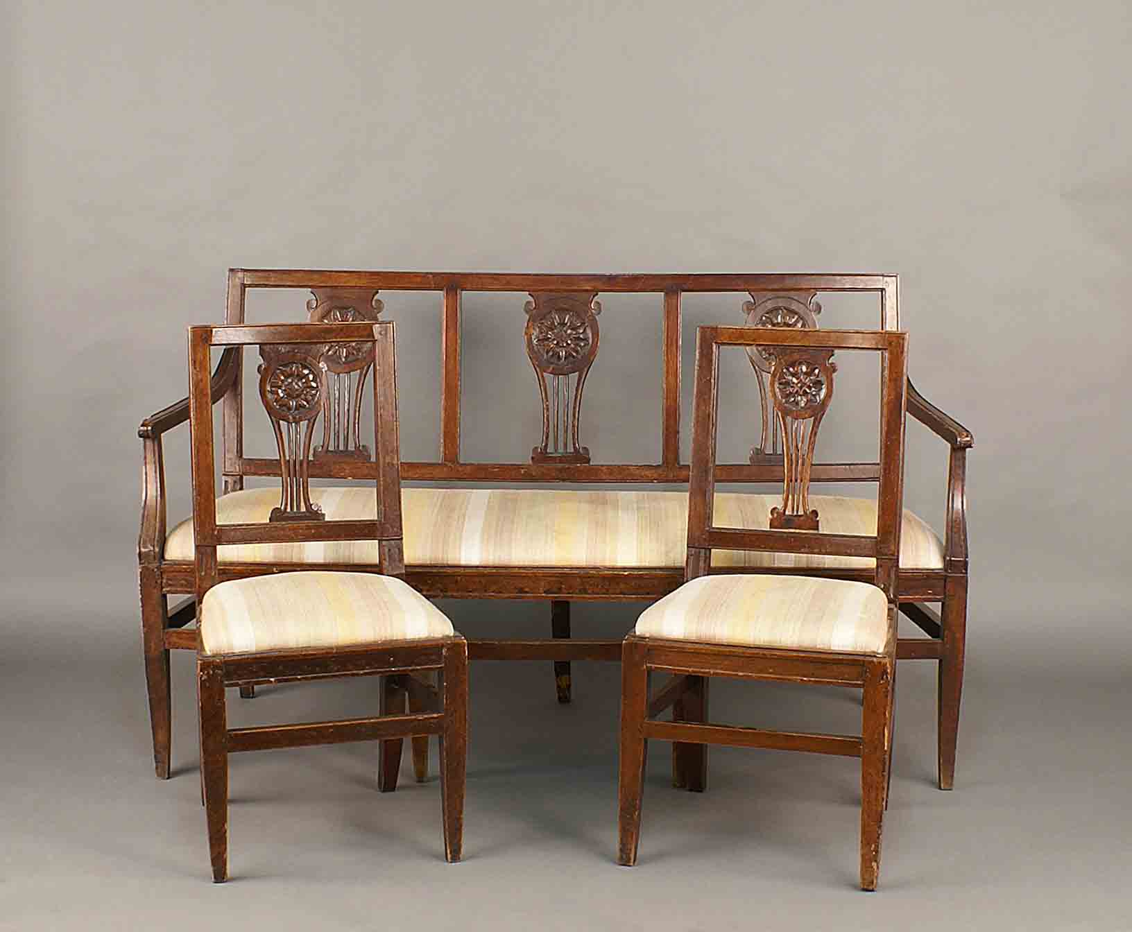 Divanetto a tre posti in legno di noce con schienale traforato ed intagliato, seduta imbottita e rivestita in tessuto, completo di due sedie an suite, primi anni del XX secolo, divanetto cm. 91x156x56 (restauri), sedie h. cm. 88.