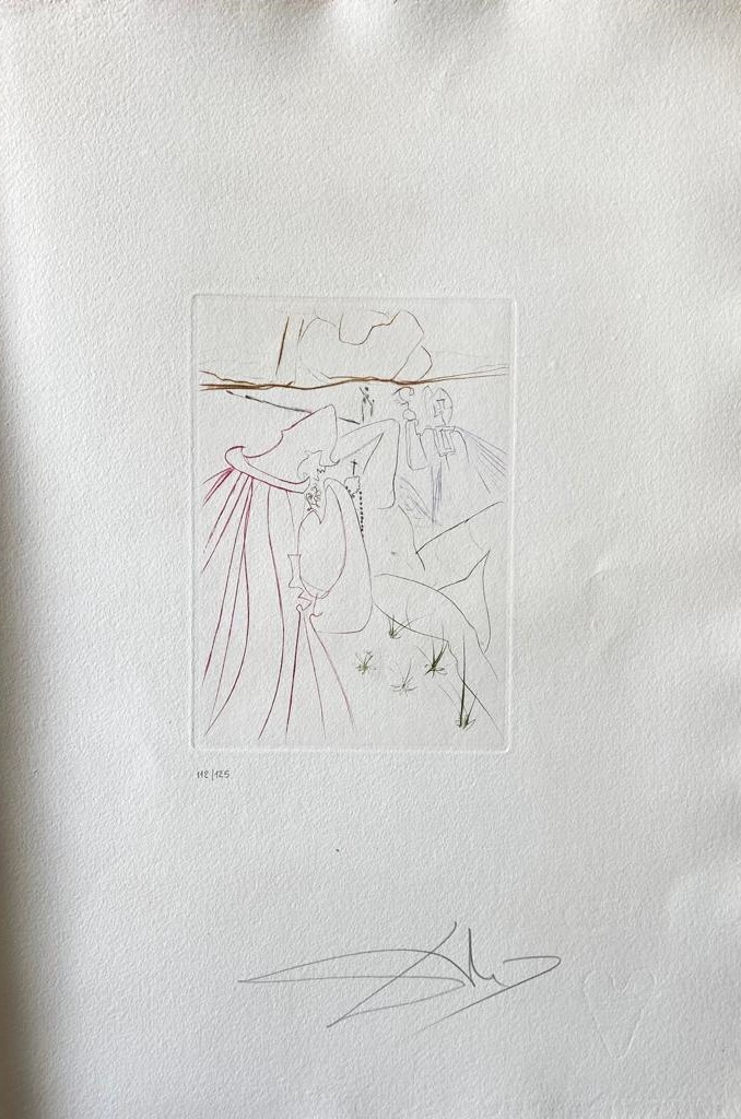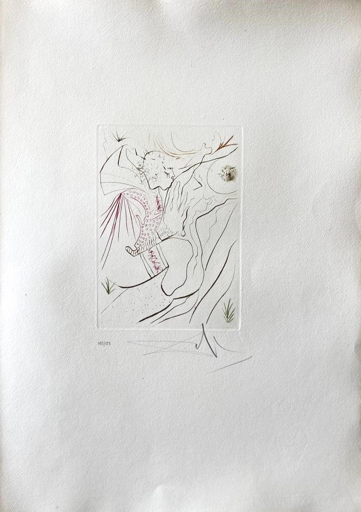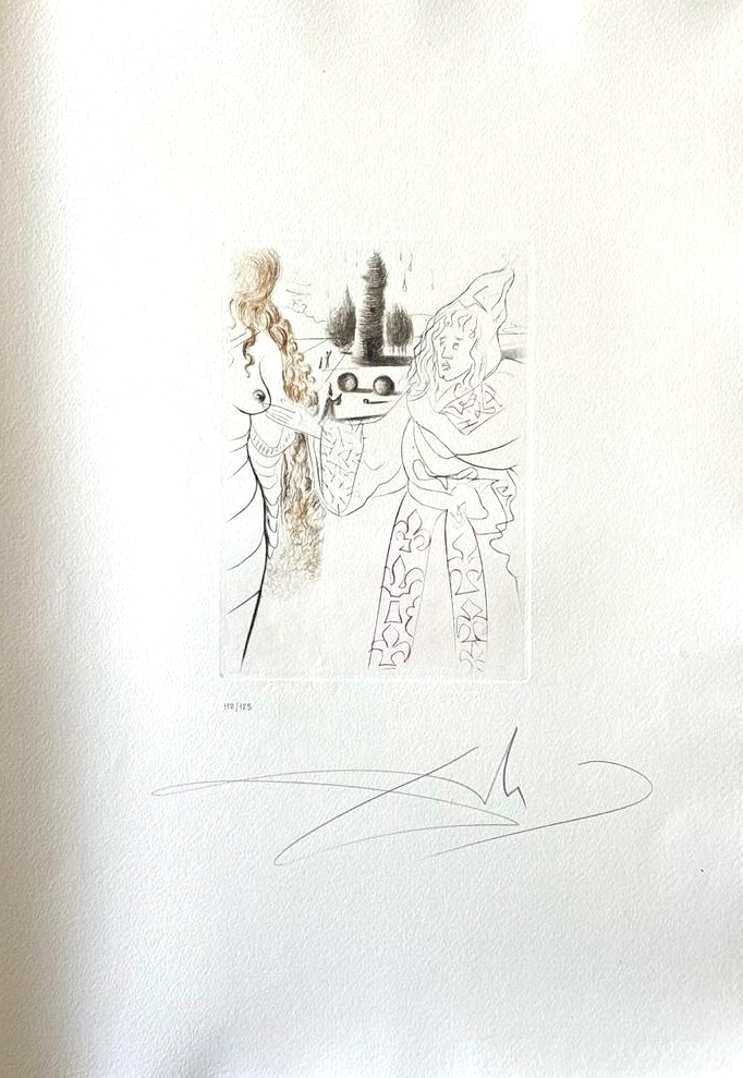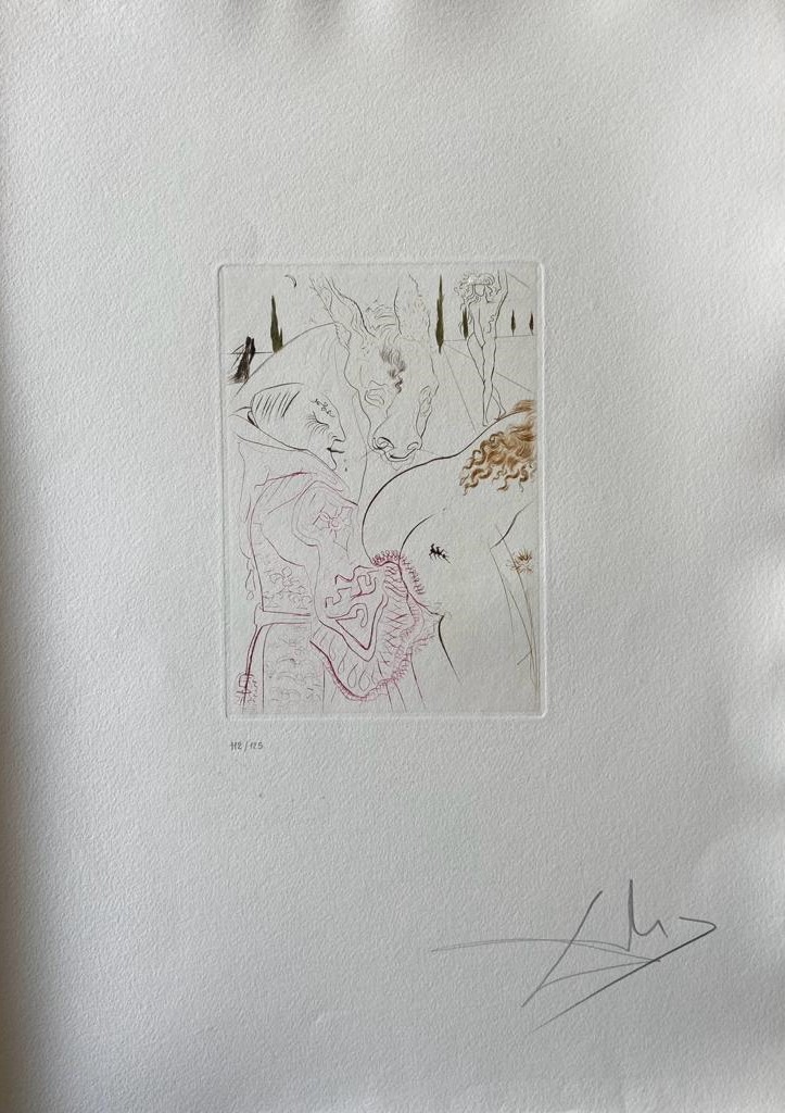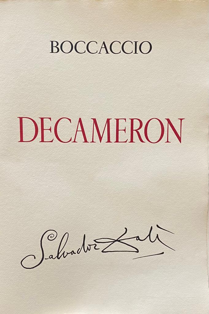 Novelle del Boccaccio relative a 10 giornate, 10 tavole eseguite a puntasecca e stampate a colori, ciascuna numerata e firmata a matita dall’artista e protette da foglio trasparente, testo a fogli sciolti, astuccio editoriale in tela color rubino