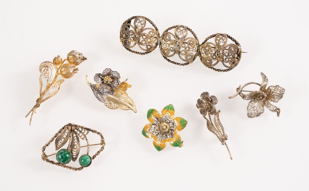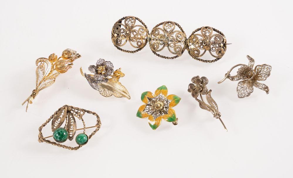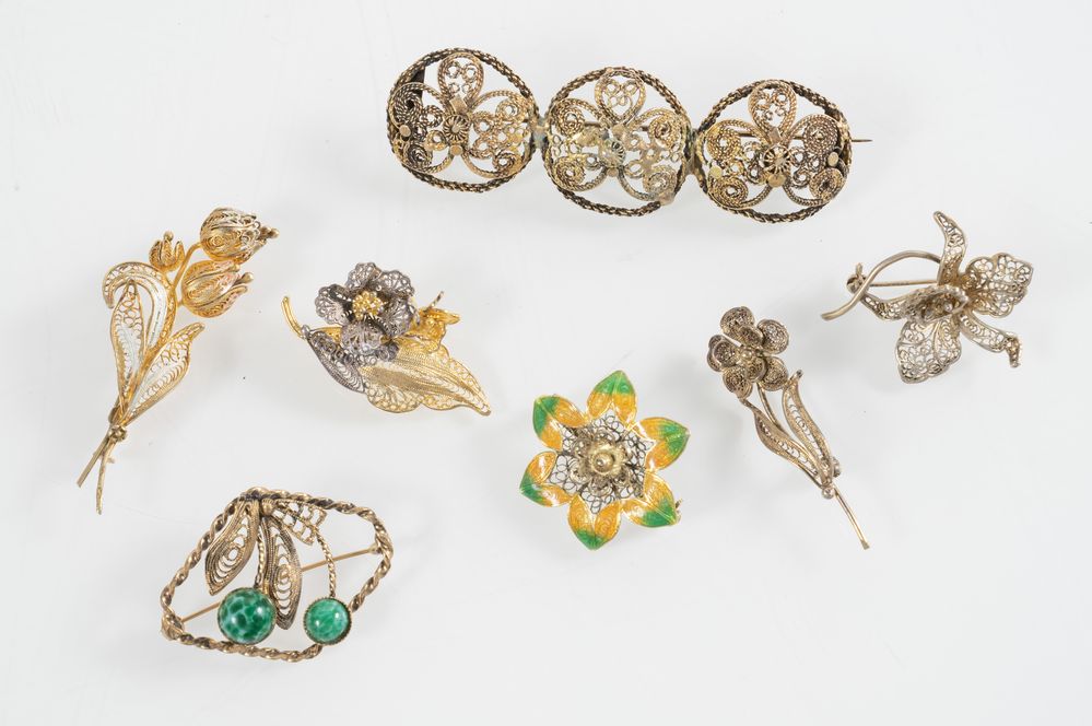 Lotto composto da sette spille con motivi floreali in filigrana d'argento dorata.