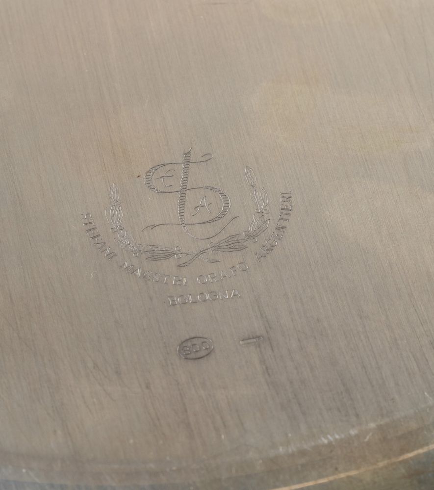 Sul piatto reca iscrizioni Ale Stefani, Es 1/300, n. 40. Al retro reca punzoni: Stefani Maestri Orafo Argentieri, Bologna, 800 e losanga locativa 9BO.