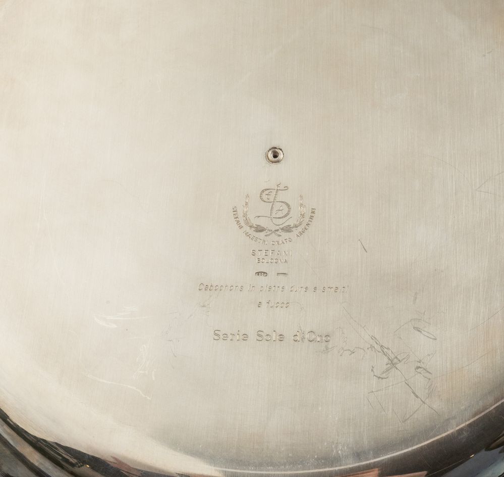 Reca parti dorate in oro 24 Kt e cabochon di pietre dure e smalti. Sul piatto reca iscrizioni Ale Stefani, Es 1/199, n. 66. Al retro reca punzoni: Stefani Maestri Orafo Argentieri, Stefani Bologna, 800 e losanga locativa 9BO. Dalla "Serie Sole d'Oro".