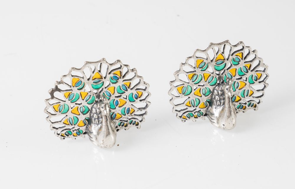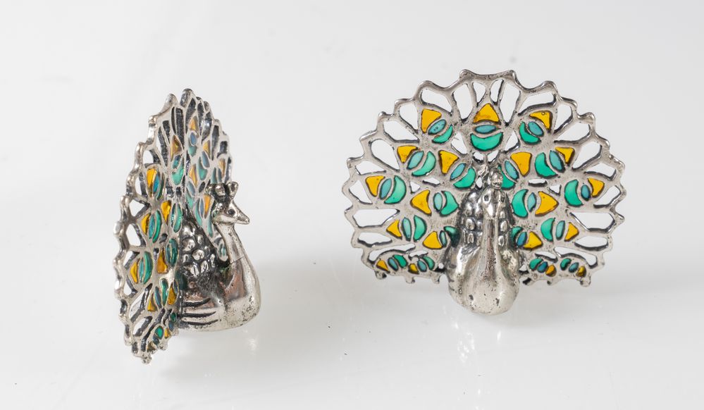 CASSETTI, Firenze, XX secolo. Coppia di segnaposto a forma di pavone in argento 925 e smalti.