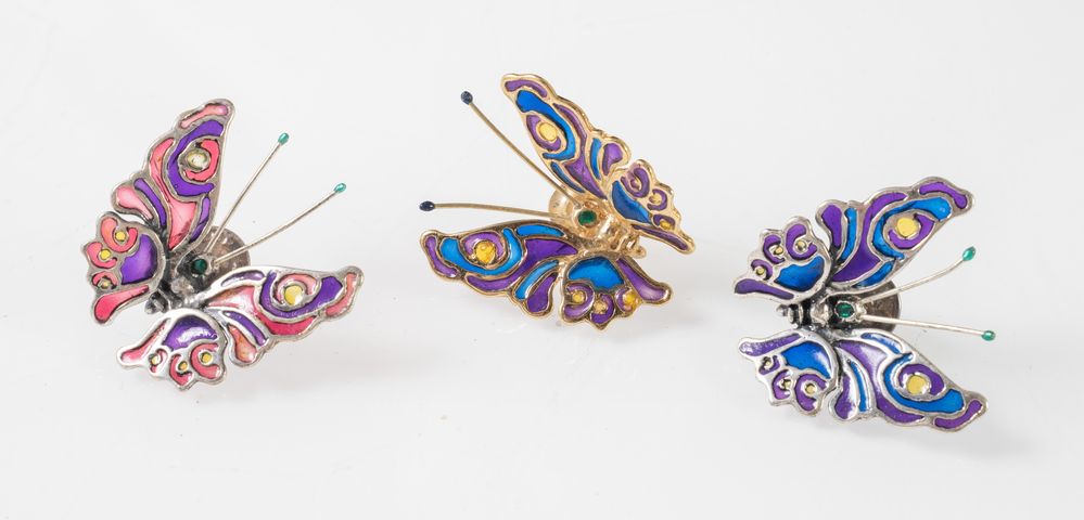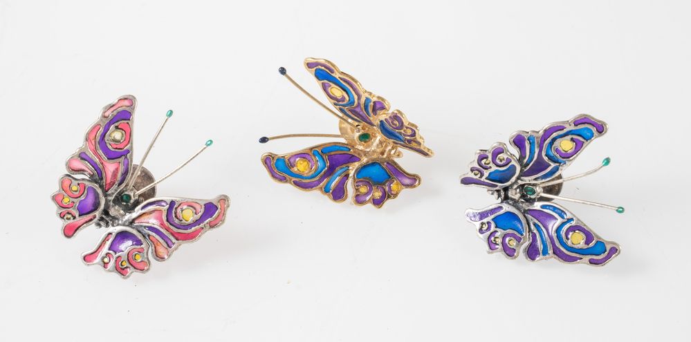 CASSETTI, Firenze, XX secolo. Lotto composto da tre spille in argento 925 e smalti.