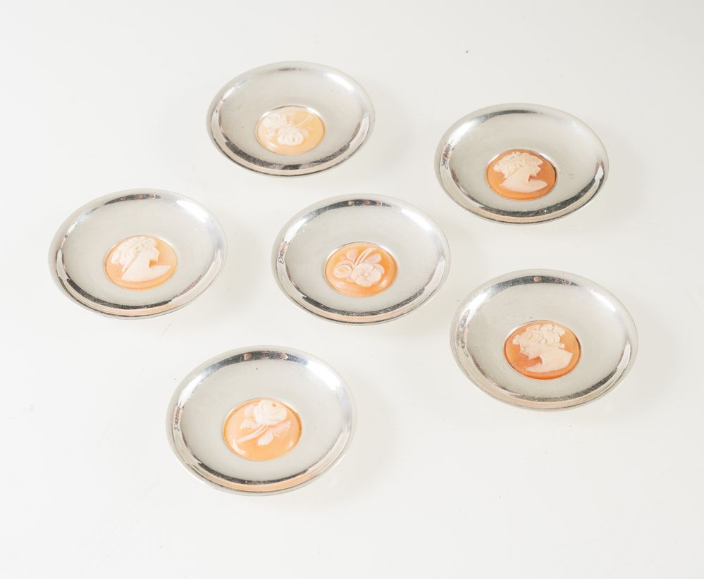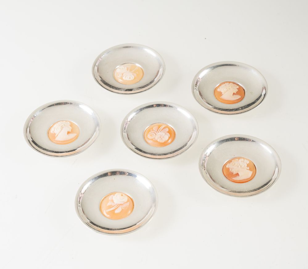 Giorgi, Vicenza, dal 1968. Lotto composto da sei segnaposti in argento 800 con cameo centrale.
