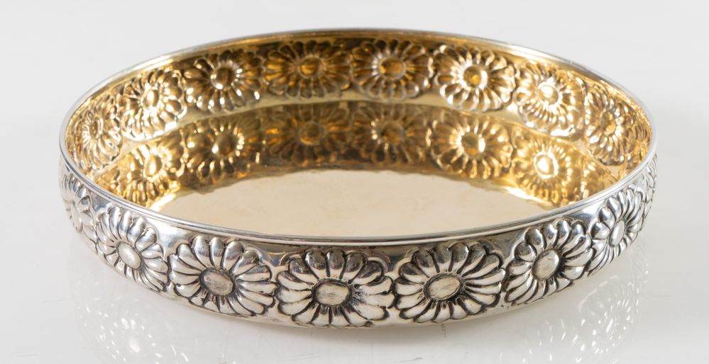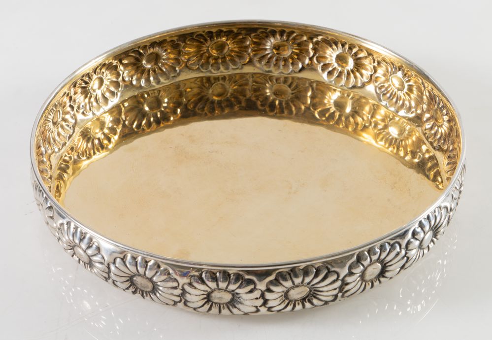 Italia, dal 1968. Piatto in argento 800, con interno vermeille e bordo con decoro floreale.