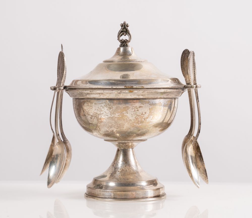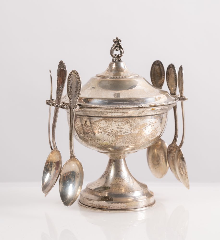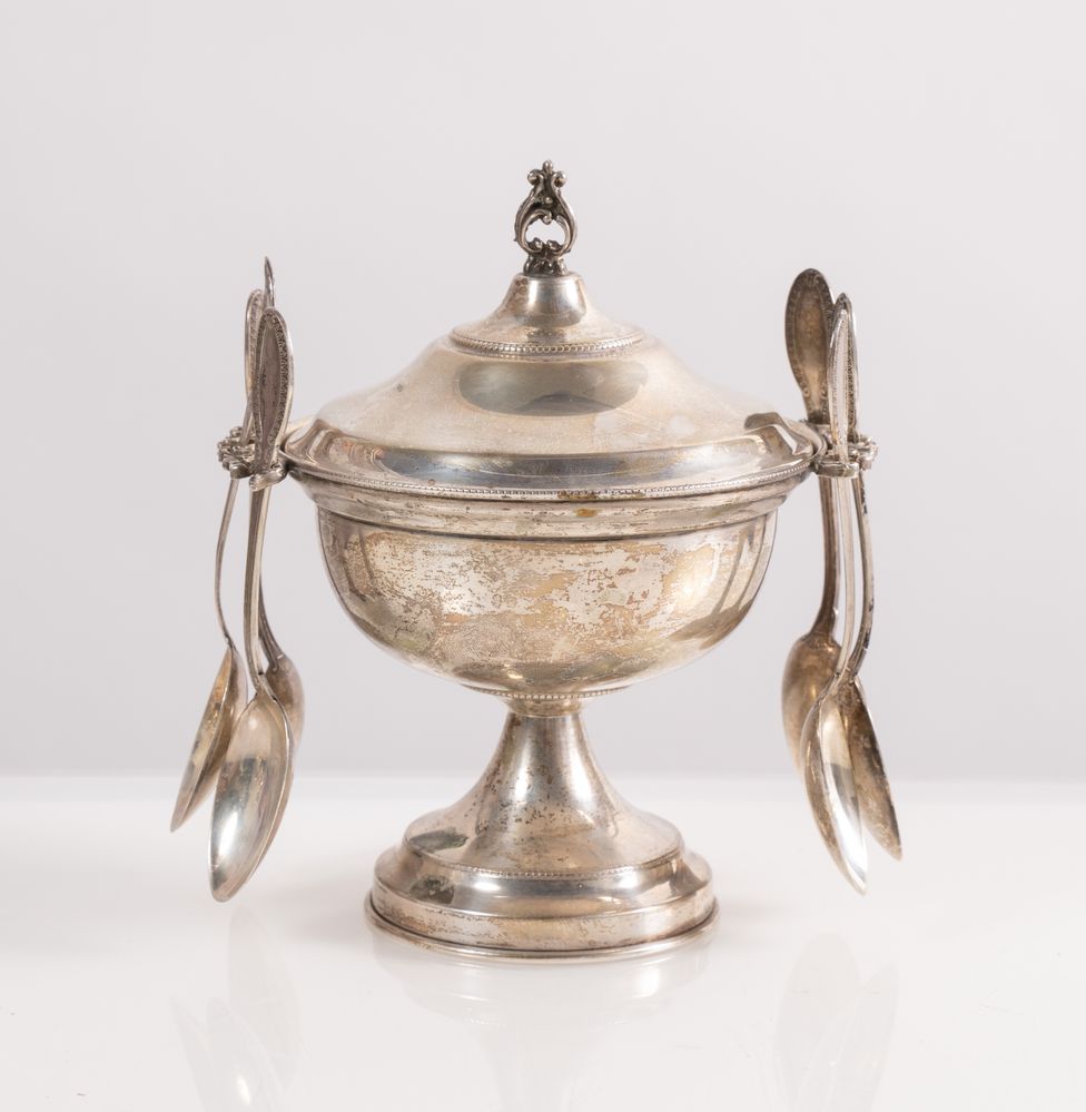 Italia, XX secolo. Zuccheriera in argento 800, con sei cucchiaini in argento 800.
