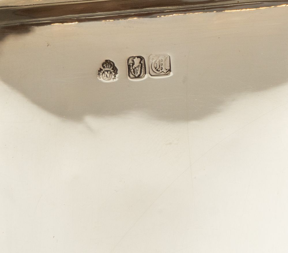 Reca scritte sul coperchio con data 31.8.16. Al retro e all'interno reca punzoni irlandesi, stemma dell'argentiere e lettera dataria. Peso complessivo: 669 gr.