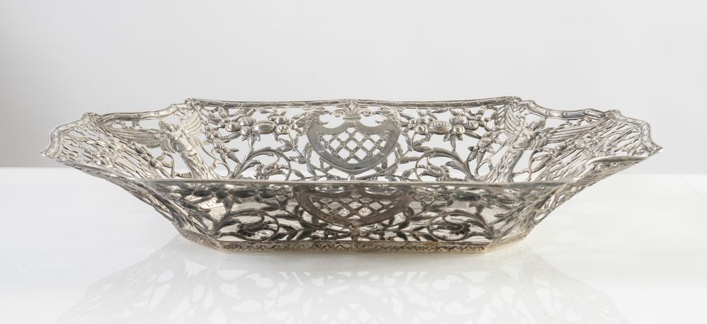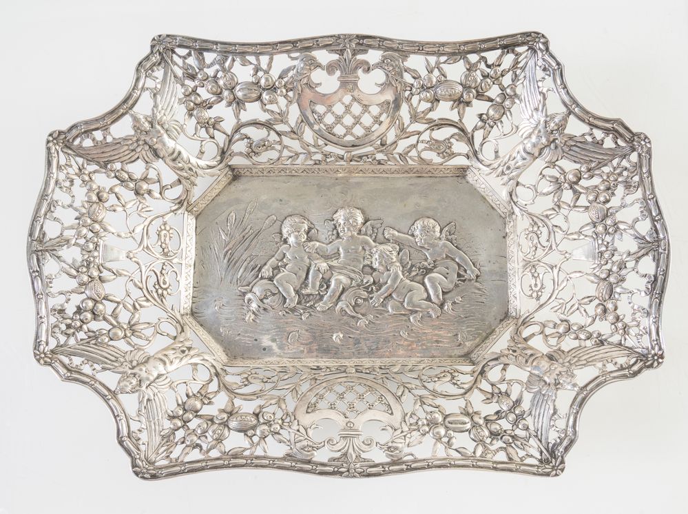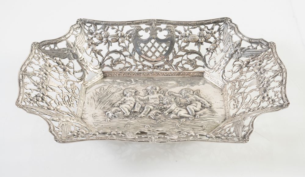 Reca bordo traforato riccamente decorato e riserva con putti sul fondo.