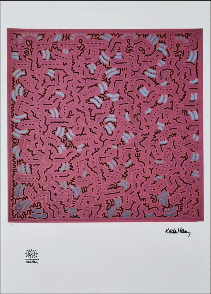 HARING KEITH Pennsylvania 1958 - New York 1990 "Senza titolo" Litografia offset su cartoncino, cm 50x70. Firma in stampa sul fronte in basso a destra, tiratura a matita 94/150, timbro a secco e timbro in stampa a sinistra.
