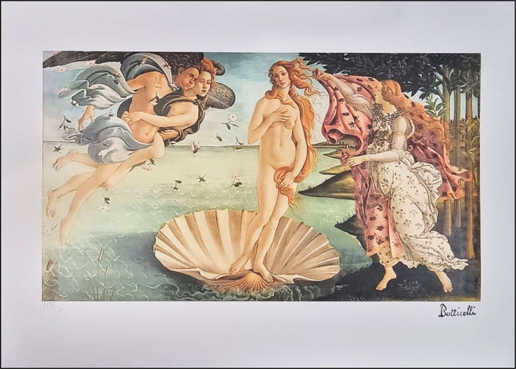 BOTTICELLI SANDRO Firenze 1445 - 1510 "Nascita di Venere" Stampa firmata in lastra su carta fine art gr. 300, cm 28x38. Firma in stampa e timbro a secco sul fronte in basso a destra, numerazione a matita 113/150 a sinistra. Certificato.