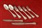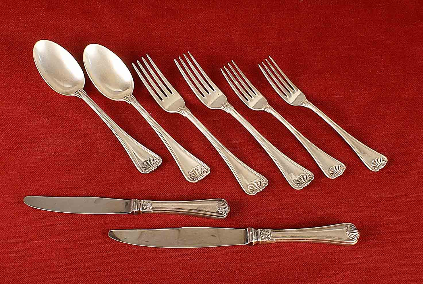 Servizio di 60 posate in argento sbalzato e decorato a motivo di conchiglia, composto da 12 forchette,12 coltelli, 12 cucchiai, 12 forchette frutta, 12 coltelli frutta, gr. 3.100 complessivi.