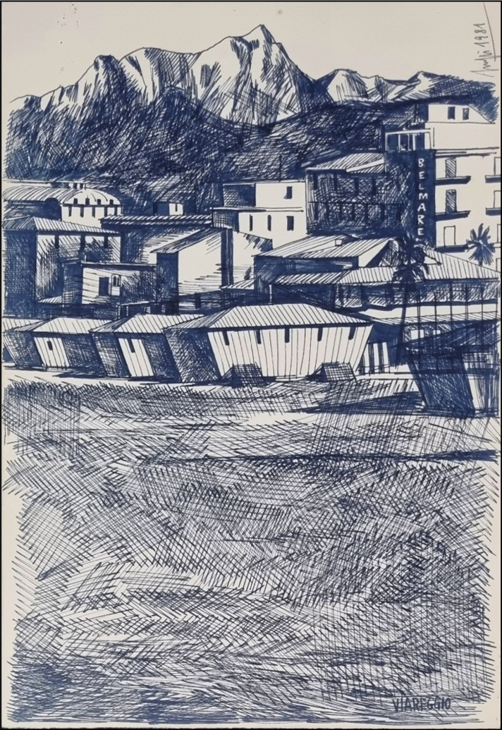 SCUFFI MARCELLO Quarrata 1948 - 2021 "Viareggio" Disegno su carta cm 21x31 del 1981. Firmato e datato sul fronte in alto a destra, intitolato in basso a destra. Autentica su foto a cura dell'artista.