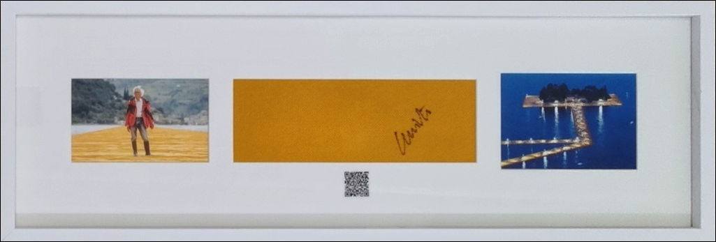 CHRISTO JAVACEV Bulgaria 1935 - New York 2020 "The floating piers" Sezione del tessuto originale che ricopriva le piattaforme galleggianti sul Lago di Iseo Sulzano, 18 giugno - 3 luglio 2016. Con foto dell'installazione e dell'artista. Sul fronte è firmato sul tessuto a destra. Sul retro etichetta descrittiva e firma dell'artista riprodotta su adesivo. Certificato di autenticità Registrato presso l'archivio dell'Associazione Autografa consultabile.