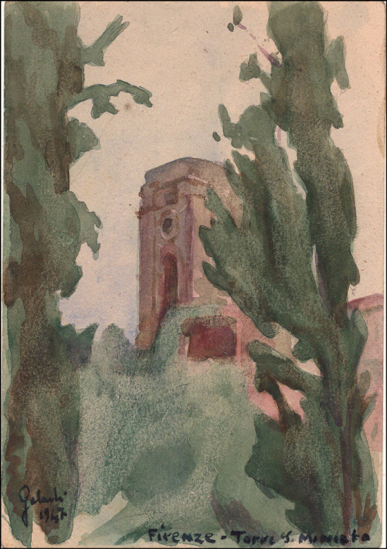 GALANTI MARIO Napoli 1923 - 1998 "Firenze, Torre San Miniato" Acquerello su cartoncino cm 10,1x14,5 del 1947. Firmato e datato sul fronte in basso a sinistra, situato a destra.