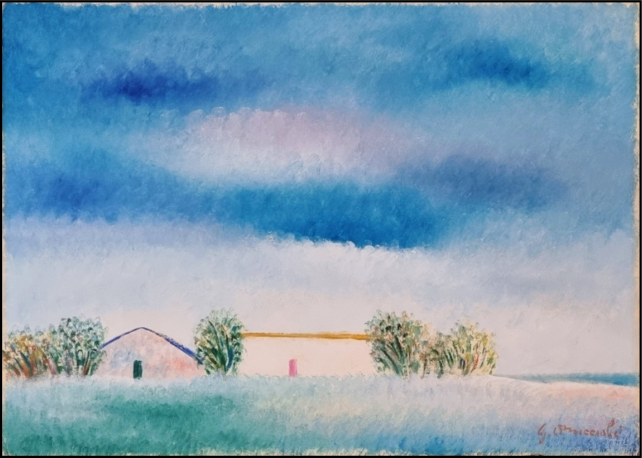 OMICCIOLI GIOVANNI Roma 1901 - 1975 "Fregene, capanna tra i cespugli" Olio su cartontavola cm 50x35. Firmato e timbrato a secco sul fronte, in basso a destra. Sul retro titolo e firma per autentica del maestro.