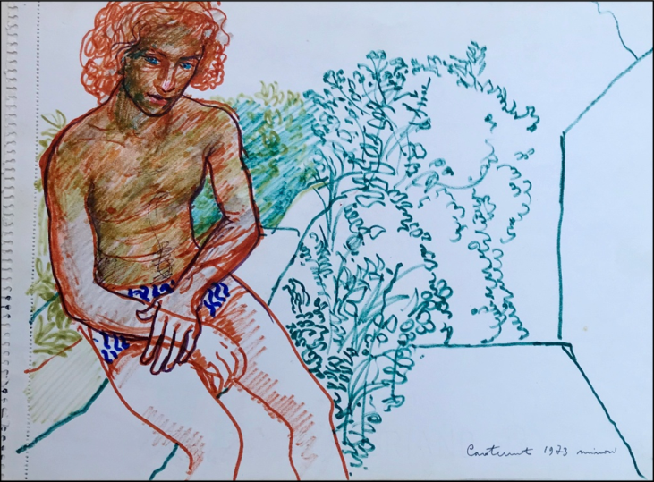 CAROTENUTO MARIO Salerno 1922 - 2017 "Ragazzo seduto" Inchiostri colorati su cartoncino cm 32,5x24, del 1973. Firmato, situato Minori e datato, sul fronte in basso a destra.