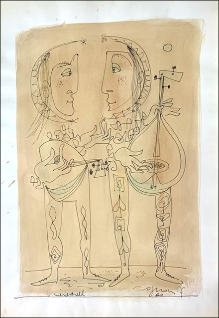 ROGNONI FRANCO Milano 1913 - 1999 "I menestrelli" Gouache su carta cm 50x70 del 1960. Firmato sul fronte in basso a destra, intitolato a sinistra.